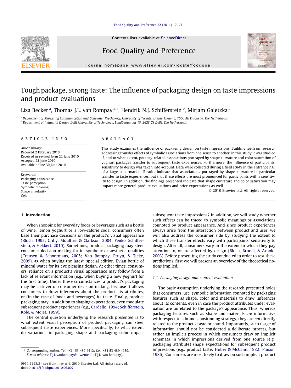 实验表明,人们可以直观地在不同的感觉域之间建立联系,这种现象称为“跨模式对应”。(例如Schifferstein&Spence,2008年)例如,Hine(1995)的一项研究表明,在七喜罐的整体绿色中添加少量(即15%)的黄色,会使消费者体验到柠檬味更多的味道(即使饮料本身没有人为添加柠檬)。同样,Schifferstein(2009)的一项研究表明,容器的材料会影响食品的体验方式,特别是在抽象或象征性口味属性(例如“易碎”)方面。这些综合研究表明,包装外观确实会影响味道评估。但是,这些结果在确定调解过程时还不清楚。换句话说,如何考量特定包装外观变化对口味评估的影响?