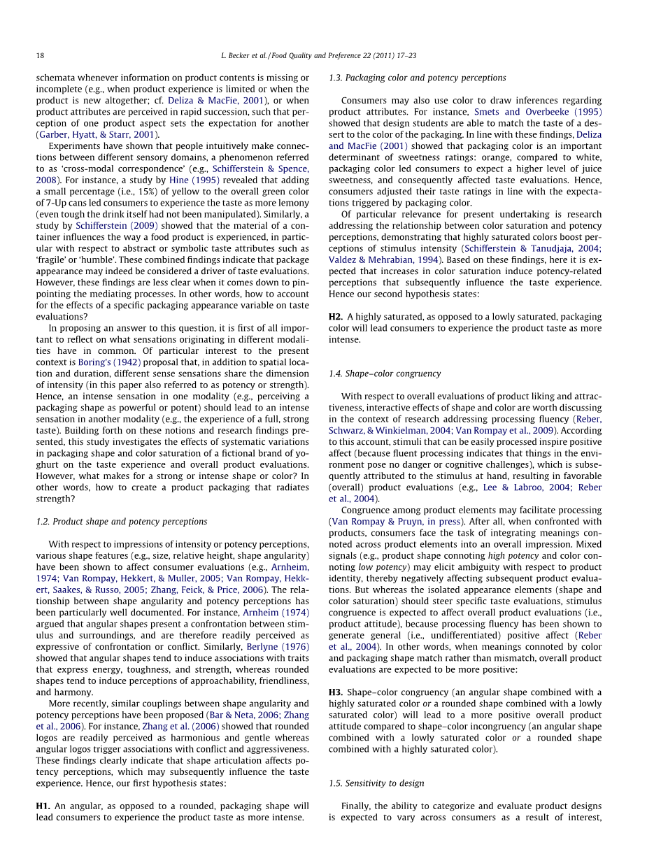 产品元素之间的一致性可能有助于加工处理。(Van Rompay和Pruyn,印刷中)毕竟,面对产品时,消费者面临着将跨越产品元素的含义并且将其整合到整体印象中的任务。混合信号(例如,表示高效能的产品形状和表示低效能的颜色)可能引起产品属性不明确,从而对后续的产品评估产生负面影响。但是,尽管孤立的外观元素(形状和颜色饱和度)应该引导特定的口味评估,但是刺激一致性会影响整体产品评估,因为加工流利度已显示出产生了一般性的积极影响。 (Reber et al。,2004)换句话说,当颜色和包装形状所代表的含义匹配时,预期整体产品评估会更加向好: