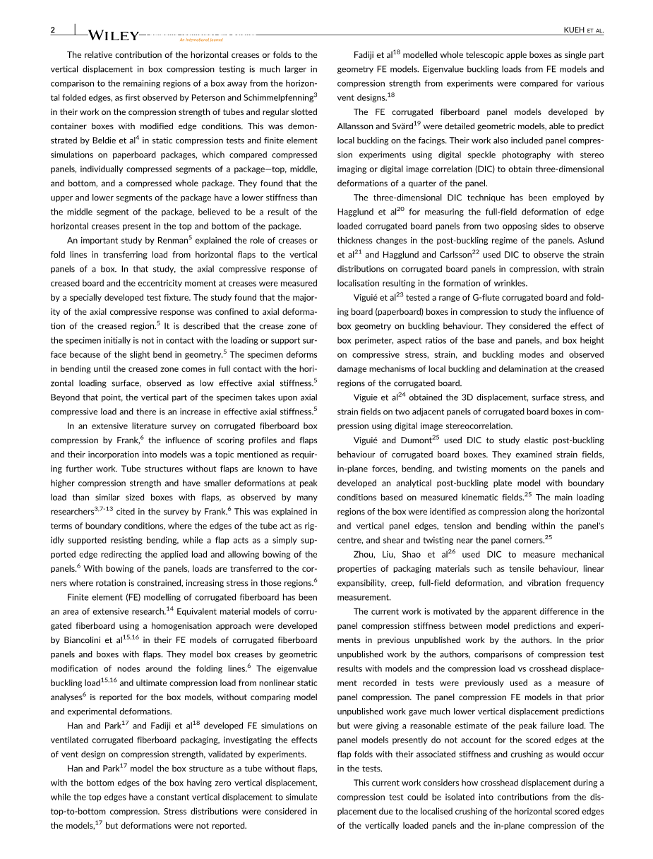 在箱型式压缩试验中,水平折痕或折线比远离水平折痕边缘的剩余区域对垂直位移的相对影响要大得多,正如彼得森和施密普芬宁在其对管式和常规槽式的可修改边缘条件纸盒的压缩强度的研究中首次观察到的那样。贝尔蒂等人在纸板包装的静态压缩试验和有限元模拟中也证明了这一点,并对面板、包装顶部、中部和底部的单独压缩段以及压缩的整个包装的结果进行了比较。他们发现,包装的上下部分的强度低于包装的中间部分,这被认为是因为包装顶部和底部存在水平褶皱。