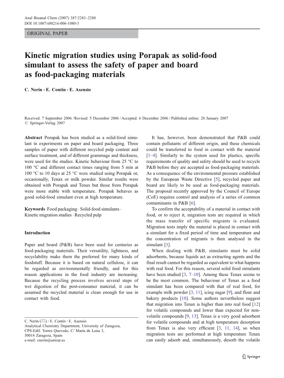 在处理P&B时,模拟物必须是固体吸附剂,因为液体作为提取剂,最终结果不可能与真实食物等价。出于这个原因,已经研究了几种固体食物模拟物[3,7-10]。 这些邦特耐克丝似乎是最常见的。邦特耐克丝作为食品模拟物的行为与真实食物的行为进行了比较,例如奶粉[3,11],糖霜[9]以及面粉和烘焙产品[10]。 然而一些作者认为,向挥发性化合物迁移到高于真实食物[12],而非挥发性化合物低于预期[9,13]。邦特耐克丝是一种非常好的挥发性化合物吸附剂,邦特耐克丝在高温下解吸也非常有效[3,11,14],所以当在高温下进行迁移试验时,邦特耐克丝可以很容易地吸附并同时解吸挥发性化合物。因此,用邦特耐克丝获得的最终偏移值不是很稳健[15]。其他固体吸附剂,例如波拉帕克,琥珀石或活性炭尚未进行评估,尽管它们已被用于多种应用以捕获有机化合物。已经研究了吸附剂如硅藻土(40%)与25%橄榄油和35%水的半固体混合物作为用于脂肪食物的食品模拟物,但结果表明混合物在高温下不够稳定因此这个原因并不推荐[10]。本文将研究波拉帕克作为P&B迁移研究的固体食物模拟物。报道并讨论了动力学研究的结果以及与邦特耐克丝和奶粉的比较结果。