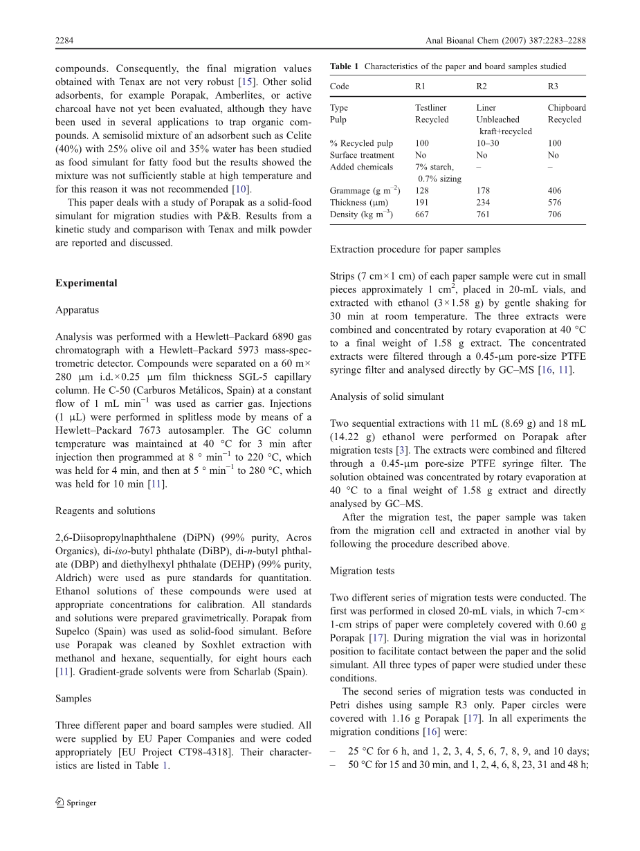 研究了三种不同的纸和纸板样品。 全部由欧盟造纸公司提供,并且编码适当[欧盟项目CT98-4318]。 表1列出了它们的特征。