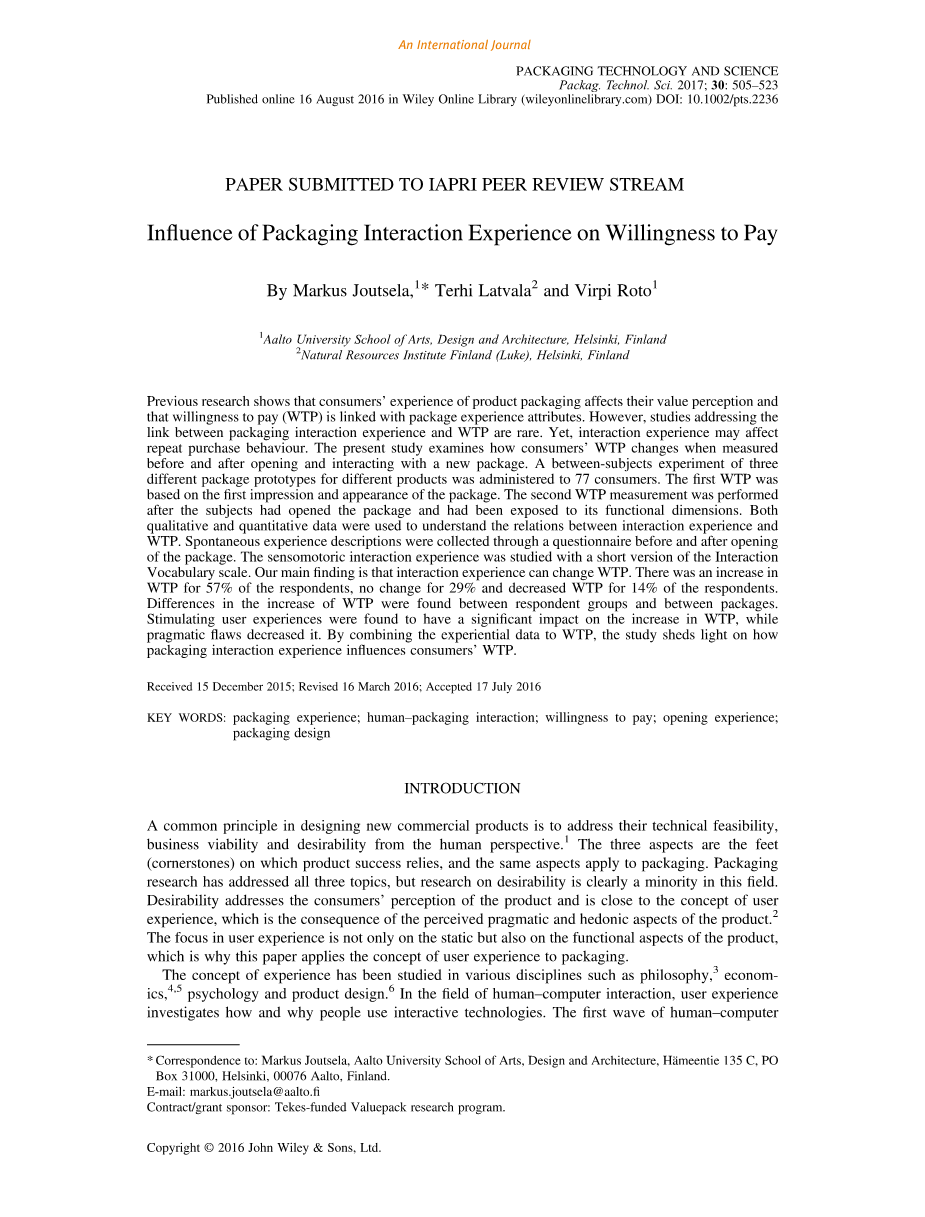 以前的研究表明,消费者对于产品包装的经验影响他们的价值观,并且支付意愿(WTP)是与包装体验情况相关联的。然而,研究表明包装交互体验与支付意愿之间的关系很小。但是,交互体验可能会影响重复购买的行为。本次研究考察消费者的支付意愿在一个新的包装打开前后是如何变化的。一个面对77名消费者的关于三种不同商品的三种不同包装样式的受测者间的试验。第一种的支付意愿是基于包装的第一印象和外观。第二种的支付意愿衡量是在被测试者打开包装并且已经看见了它的功能和尺寸之后。定性和定量的数据都被用来了解交互体验和支付意愿之间的关系。自身经历的描述是通过包装打开前后的调查问卷收集到的。我们通过一个简短的交互词汇表研究了sensomotoric交互体验。我们的主要发现是交互体验可以改变支付意愿。结果是57%的反馈者增加了支付意愿,29%的人没有变化,还有14%的人减少了支付意愿。我们在受访者各组之间和各个包装之间发现了支付意愿增长有差异。我们发现,当实用性不足减少支付意愿时,刺激的用户体验对支付意愿的增长有重要的意义。通过结合体验数据和支付意愿,研究揭示了包装交互体验如何影响消费者的支付意愿。
