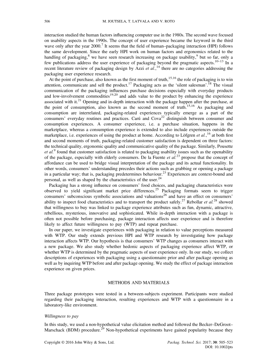 研究中使用的包装是由一个阿尔托大学的学生在跨学科的包装设计课程设计中设计的。在课程期间,学生们在包装行业的实际项目中与跨学科团队合作。课程开始时,公司向团队简要介绍了设计项目的目标、范围和局限性。还讨论了设计的经验目标。本课程的教学方法是基于问题和项目,以各种专题讲座为基础。至于课程结果,学生们为客户开发了包装概念、实物模型和项目报告。在这项研究中,三个不同产品的包装原型被用作样品材料。对于消费者的体验评价,每个包装的原型都是由专门的包装印刷厂生产的。他们通过目标群体的少数参与者的经验对原型进行了评估,并在包装袋打开前后两种情况下测量了参与者的支付意愿。