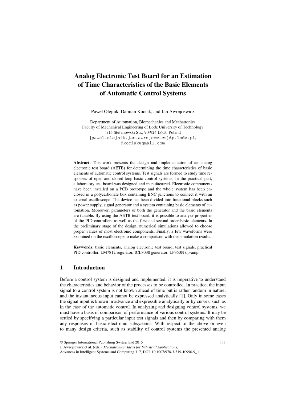 本文介绍了用于确定自动控制系统基本元件时间特性的模拟电子测试板(AETB)的设计和实现。测试信号的形成是为了研究开环和闭环基本控制系统的时间响应。在实际部分,设计和制造了一个实验室测试板。电子元件已安装在PCB原型上,并且整个系统已装入包含BNC接头的聚碳酸酯箱中,以将其与外部示波器连接。该设备按功能模块划分,可分为电源,信号发生器和包含自动化基本元件的系统。而且,发生器和基本元件的参数都是可调的。通过使用AETB测试板,可以分析PID控制器的属性以及一阶和二阶基本元素。在设计的初步阶段,数值模拟允许选择大多数电子元件的适当值。最后,在示波器上检查了几个波形,以便与仿真结果进行比较。
