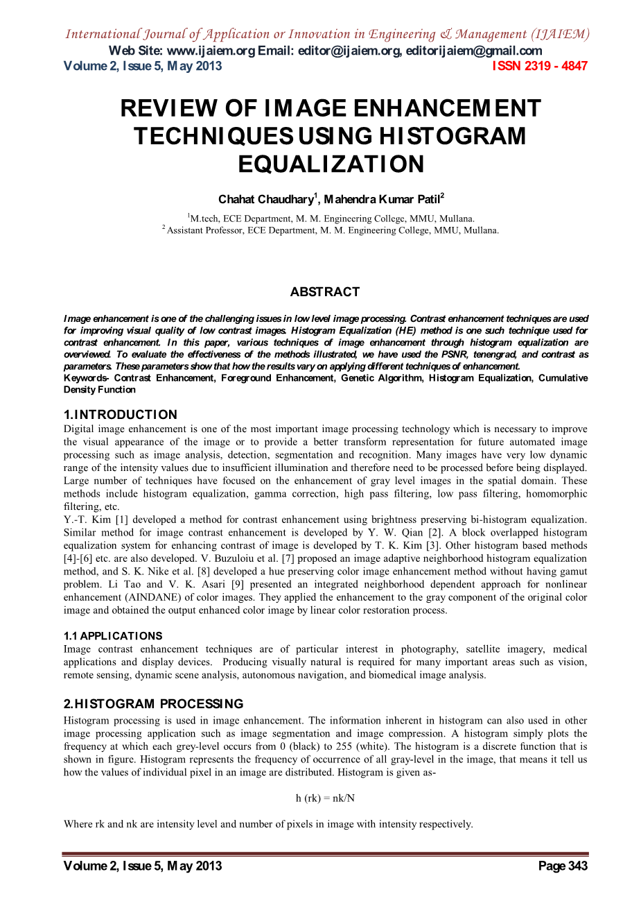 摘要 图像增强技术是图像处理中富有挑战性的问题之一,使用对比度增强技术可以改善对比度低的图像的画质,直方图均衡化(HE)方法就是这样一种用于增强对比度的技术,而本文将概述基于直方图均衡化的各种图像增强技术。 我们将PSNR,tenengrad和对比度作为参数来评估所用方法的有效性,在应用不同的增强技术时这些参数将发生变化。