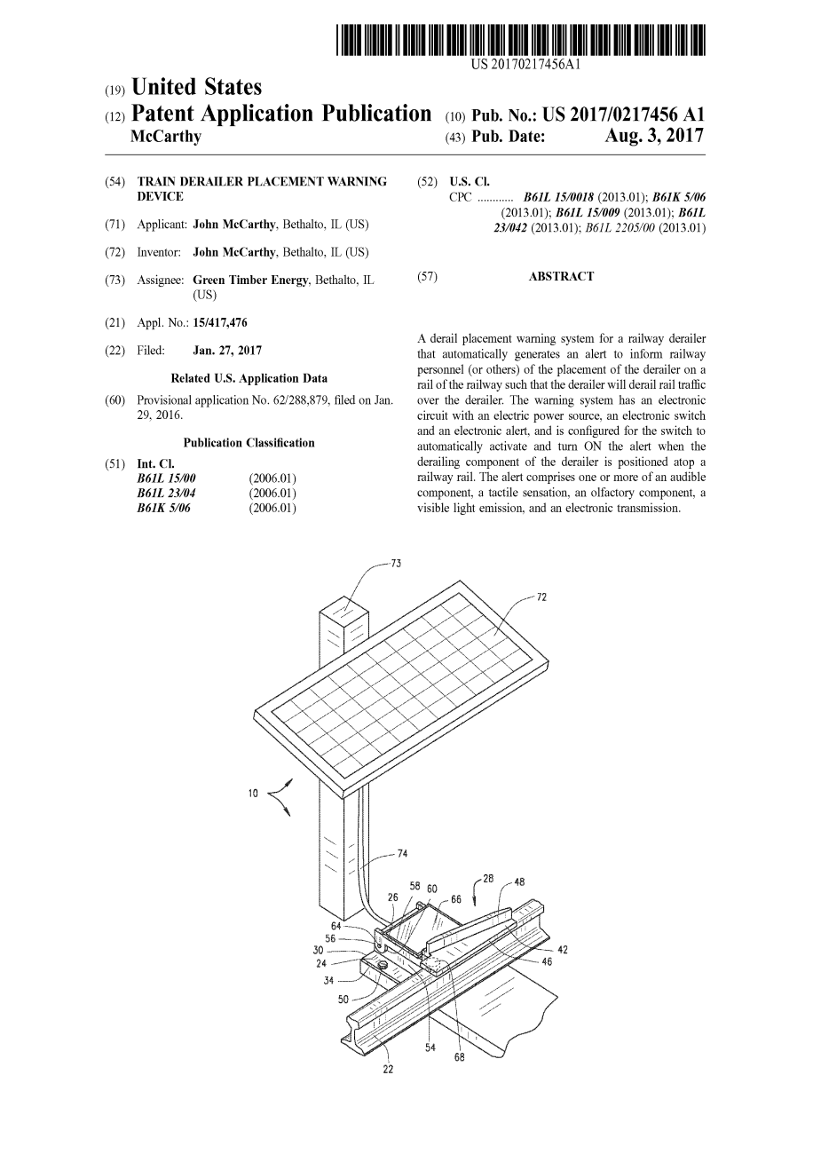 参考资料:这个专利的提出得益于一个于2016年1月29日提出的名字为脱轨器报警装置的设置的美国临时专利,该专利的编号为62/288879。参照上述公开专利的内容也包含在本专利当中。