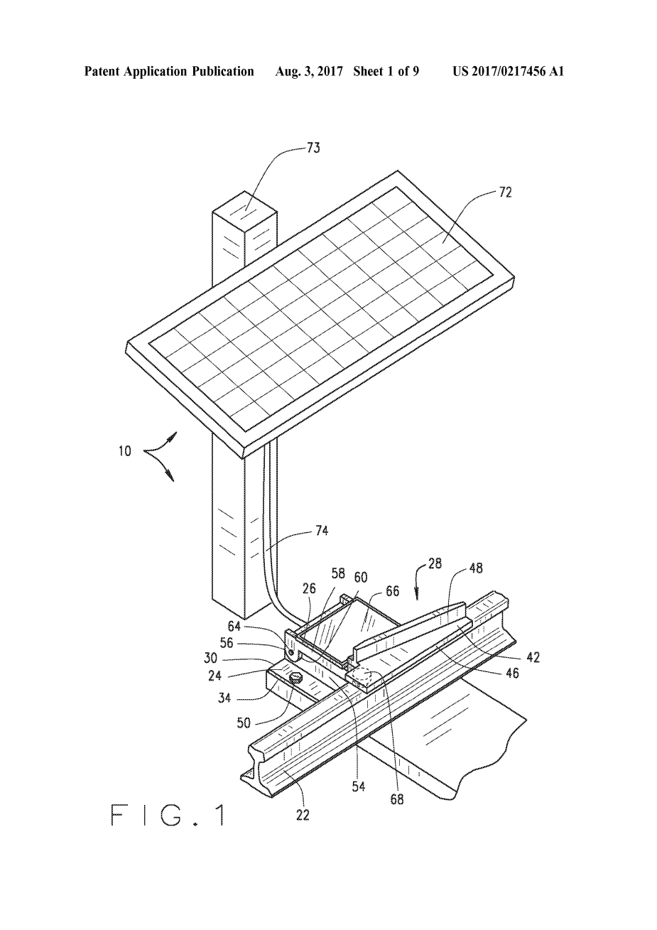 压力开关68被配置成在未激活的情况下处于OFF位置(即当没有压力施加到压力开关时),可切断蓄电池70和灯板66之间的电流,从而使灯板66处于关闭状态。然而,当颈板26绕轴销64旋转到位置A时,位于楔板28和脚踏板42下面的压力开关68接触到轨道22的顶部,从而激活压力开关68,压力开关68激活后将蓄电池70和灯板66连接起来,从而启动灯板66。然后灯板66提供灯光警报信号,脱轨器10也处于激活状态,并将轨道22附近的机车进行脱轨。相反,当颈板26绕轴销64旋转到远离轨道22的位置时,位于楔板28和脚踏板42下面的压力开关68被释放,压力开关68被关闭,从而切断从蓄电池70到灯板66的电流。为了延长这个警报信号的持续时间,太阳能充电器72将直接提供一个连续的电流给蓄电池70充电。