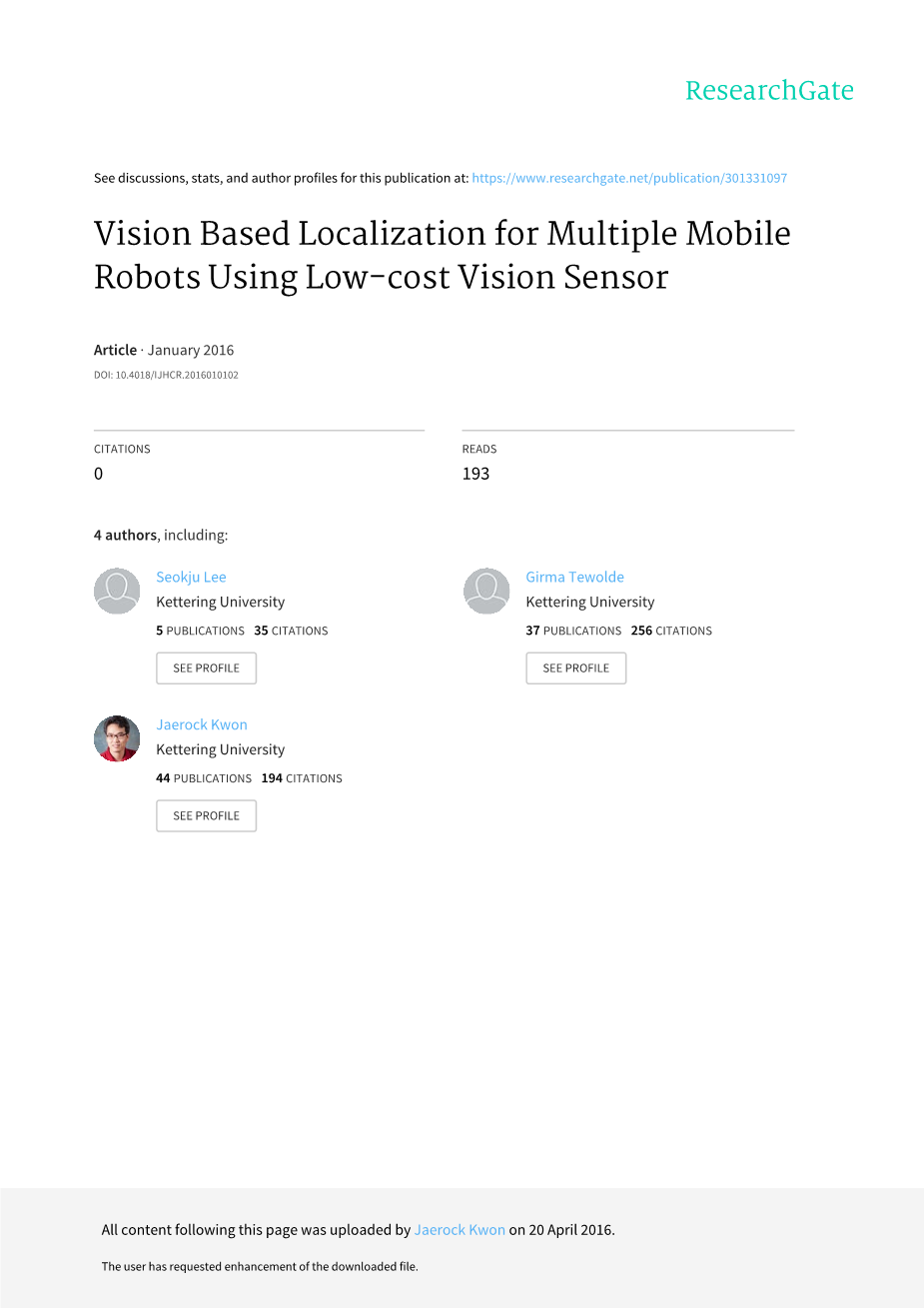 Baatar等人提出了类似于本文提出的方法。 [7]通过检测特定的标记来识别使用吸顶式摄像头的多移动机器人。他们采用了一种定位方法,该方法结合了使用从轮编码器收集数据和基于视觉的定位的odometry。使用扩展卡尔曼滤波器(EKF)实现测距和基于视觉的定位数据的融合。该方法使用高质量相机和提供测距的移动机器人平台,能够实现良好的定位结果,最大定位误差为12 mm,最大定位误差为1.7o。我们的视觉传感器不仅更轻,更快,更便宜,更高效,而且由于使用颜色代码而不同于视觉传感器,因此可以区分许多移动机器人。