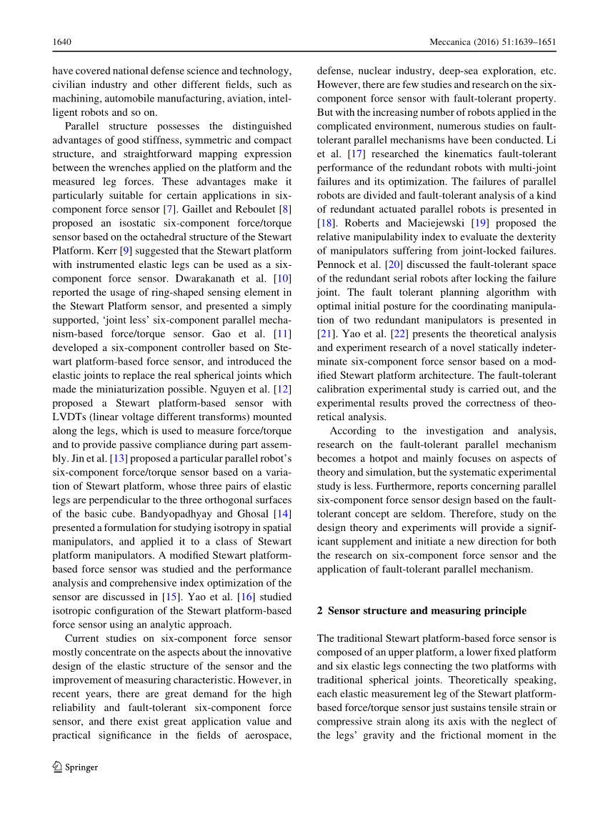 目前对六维力传感器的研究主要集中在传感器弹性结构的创新设计和测量特性改进方面。但近年来对高可靠性、容错性六维力传感器的需求量很大,在航空航天,国防,核工业,深海勘探等领域具有很大的应用价值和实用意义。然而,对于具有容错性能的六分量力传感器的研究还很少。但随着复杂环境下机器人数量的增加,对容错并联机构进行了大量的研究。 Li等人[17]研究冗余机器人多关节故障的运动学容错性能及其优化。并行机器人的故障是分开的,并且在[18]中提出了一种冗余驱动的并联机器人的容错分析。 Roberts和Maciejewski [19]提出了相对可操作性指数来评估遭受连锁故障的机械手的灵活性。 Pennock等人[20]在锁定失效接头后讨论了冗余串行机器人的容错空间。文献[21]给出了两种冗余操纵器协调操作的最优初始姿态容错规划算法。姚等人。文献[22]提出了一种基于改进的Stewart平台结构的静态不确定六维力传感器的理论分析和实验研究。进行容错校准实验研究,实验结果证明了理论分析的正确性。