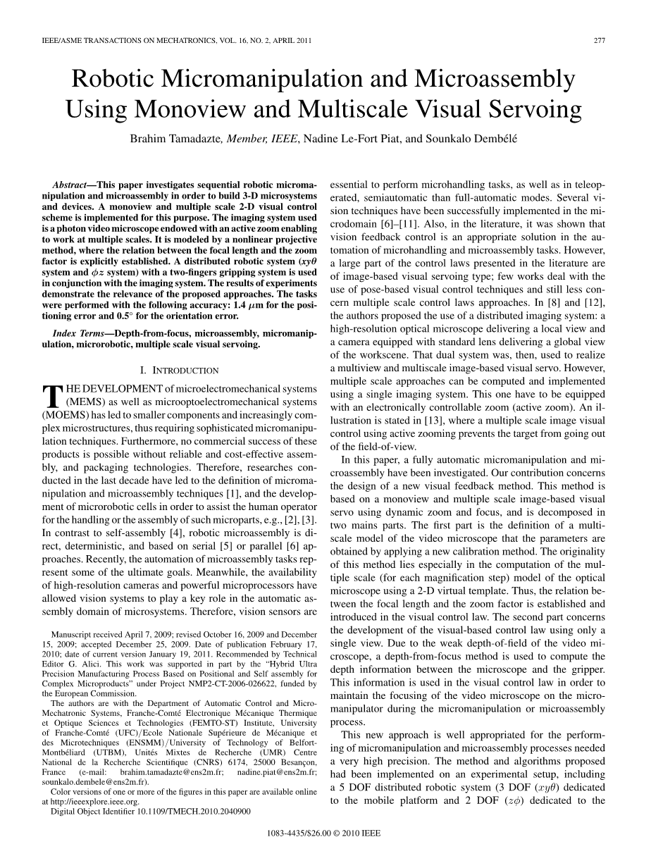 本篇论文主要研究全自动显微操作和和微装配。我们主要的贡献是设计新的视觉反馈方法。这个方法是在单视野和基于图像的多倍数主动变倍、主动聚焦伺服控制实现的。这个方法分为两个主要部分。第一部分是可变倍摄像显微镜的清晰度。这个参数需要通过新的标定方法来获取。这个方法的创意源于2维光学显微镜多放大倍数(对于每个放大步骤)的计算模式。因此,视觉控制规律可以解释焦距和放大倍数之间的关系。第二部分着重考虑基于单视野视觉控制规律的视觉的发展。由于显微摄像机景深不足,因此使用焦深来计算显微镜头和夹具之间的距离信息。这个信息用于,在显微操作和微装配中的显微镜头获取聚焦图像的视觉规律上使用。