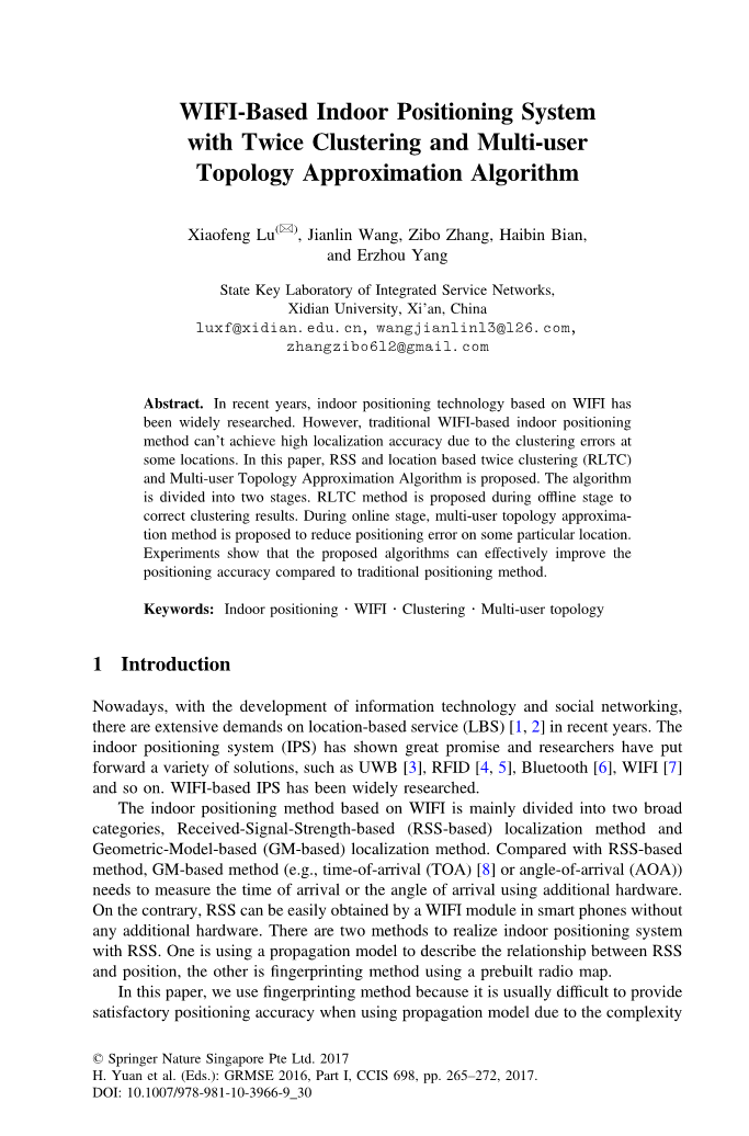 近年来,基于WIFI的室内定位技术得到了广泛的研究。然而,传统的基于WIFI的室内定位方法由于某些位置的聚类错误而无法实现较高的定位精度。本文提出了基于RSS和位置的两次聚类(RLTC)和多用户拓扑近似算法。该算法分为两个阶段。在离线阶段提出RLTC方法来纠正聚类结果。在在线阶段,提出了多用户拓扑近似法来减少某个特定位置的定位误差。实验表明,与传统的定位方法相比,该算法可以有效提高定位精度。