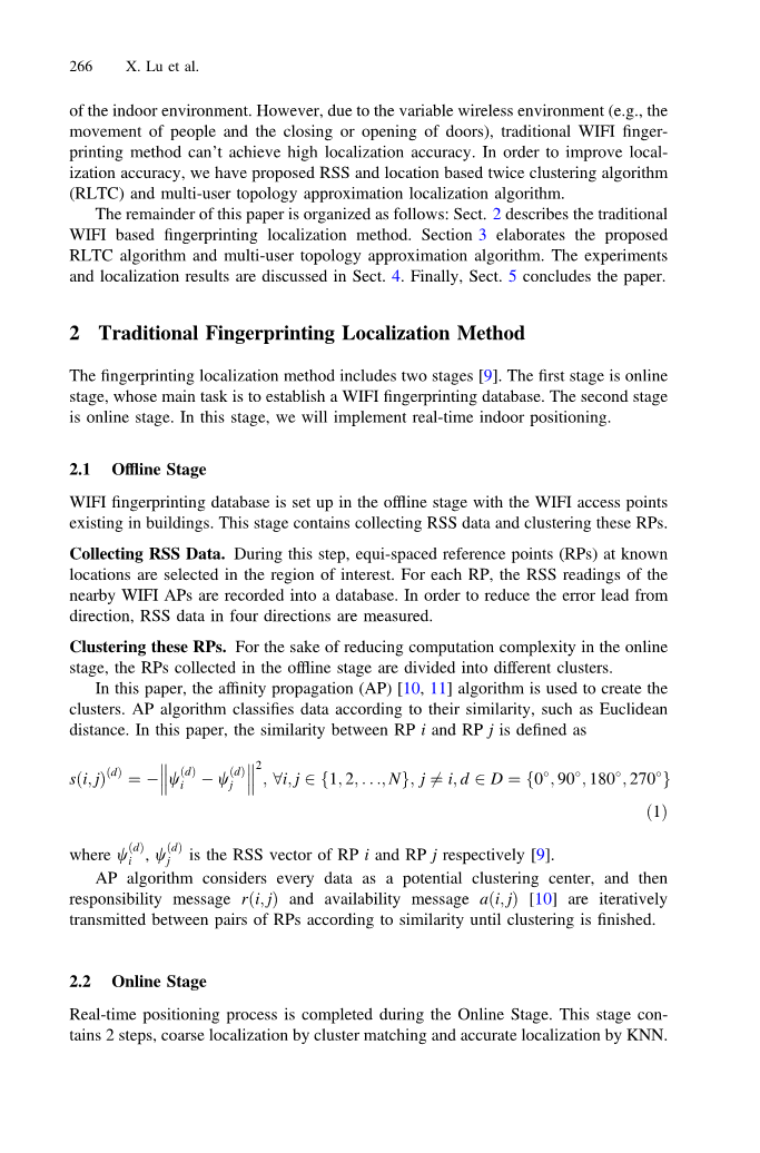 在本文中,我们使用指纹法,因为室内环境的的复杂性,在使用传播模型时通常难以提供令人满意的定位精度。然而,由于可变的无线环境(例如,人员的移动以及门的关闭或打开),传统的WIFI指纹识别方法也无法实现较高的定位精度。为了提高定位精度,我们提出了基于RSS和位置的两次聚类算法(RLTC)和多用户拓扑近似定位算法。