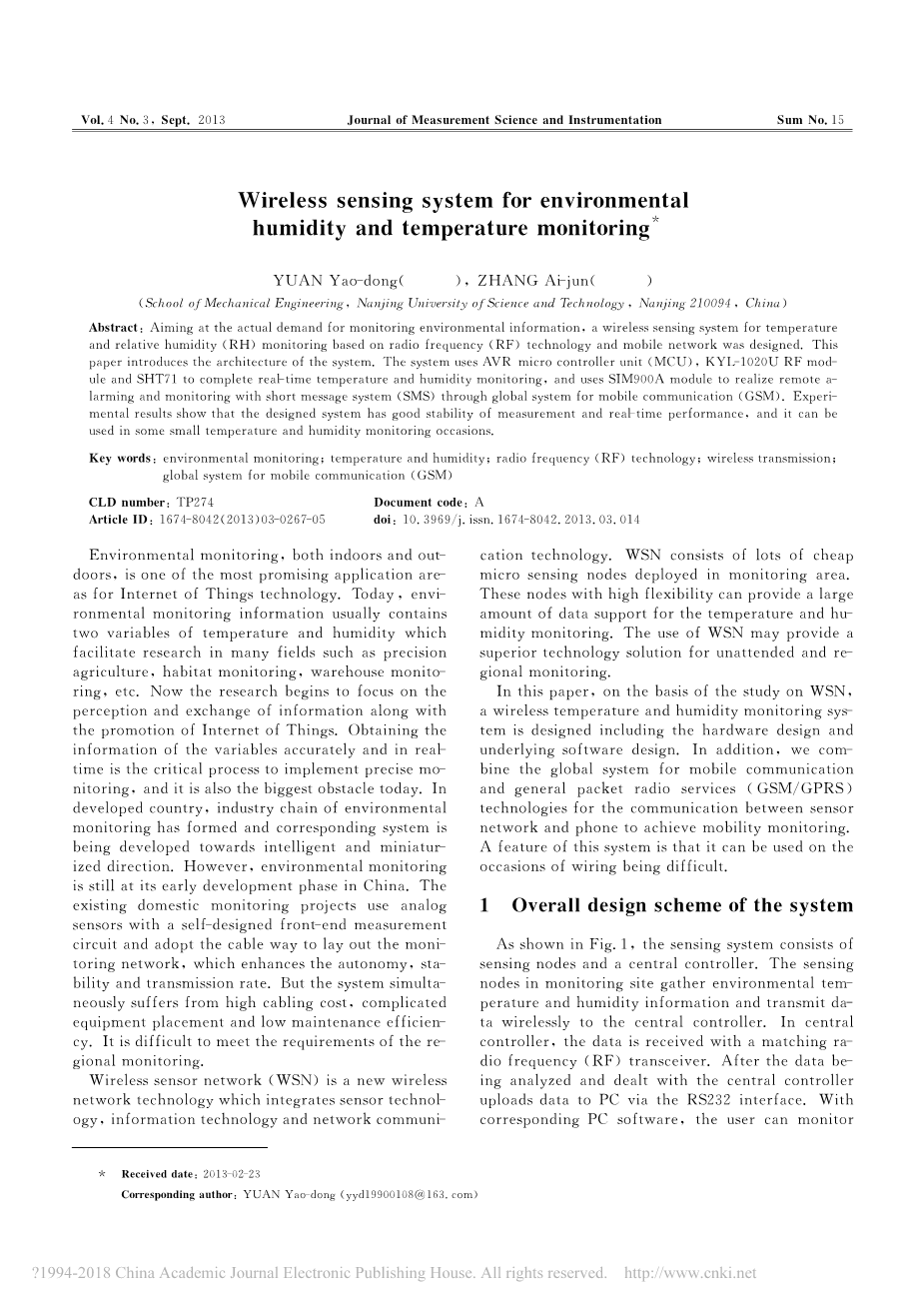 关键词:环境监测;温度和湿度;无线电频技术;无线传输;全球移动通信系统