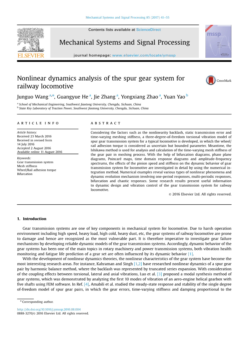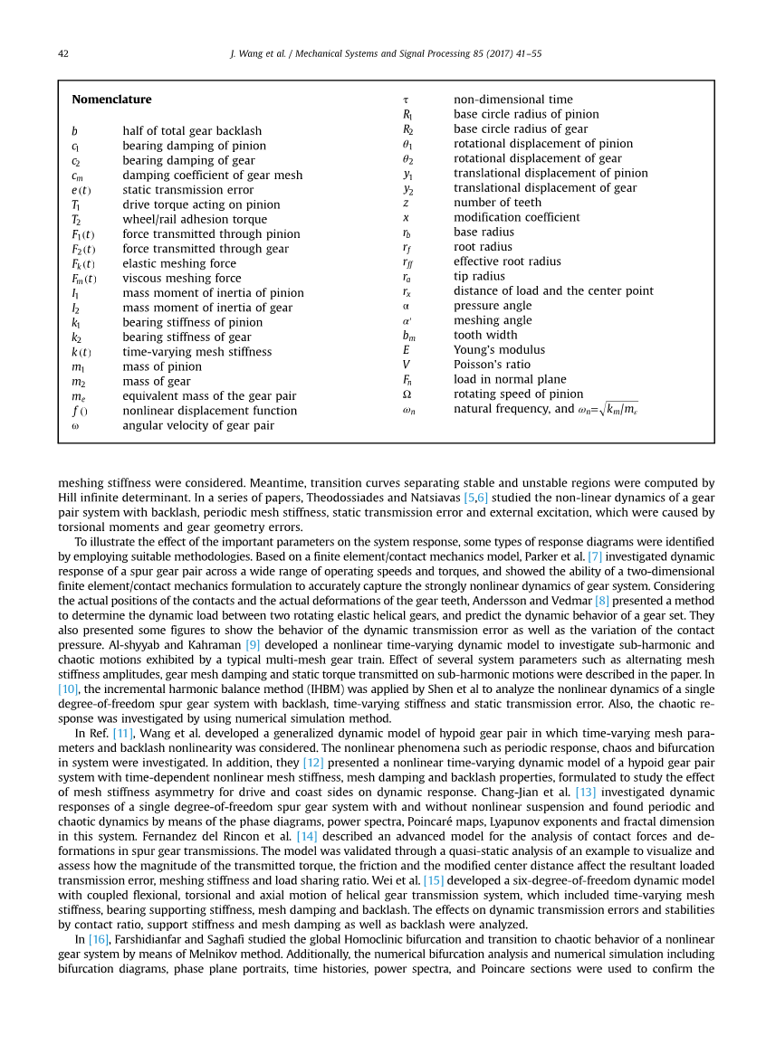 建立了一种考虑时变啮合和侧隙非线性的准双曲面齿轮副广义动力学模型。研究了系统的周期响应、混沌和分岔等非线性现象。此外,(12)提出了具有时变非线性啮合刚度、啮合阻尼和侧隙特性的准双曲面齿轮副系统的非线性时变动力学模型,研究了驱动面和边面啮合刚度不对称对动力响应的影响。[ 13 ]研究了一种自由的齿轮系统动态响应单自由度和非线性悬架和发现周期性动态变化的相图,意味着能量谱分析及混沌,Poincareacute;地图,在这个系统的Lyapunov指数和分形维数。[ 14 ]描述了一种用于分析直齿圆柱齿轮传动接触力和脱层的先进模型。通过一个实例的准静态分析验证了模型的正确性,并评估了传递扭矩的大小、摩擦和修正的中心距离对产生的传动误差、啮合刚度和载荷分担比的影响。魏等人。[ 15 ]开发了一个六度的弯曲自由度耦合动力学模型,扭斜齿轮传动系统的运动和轴,其中包括时变啮合刚度、轴承支承刚度、啮合阻尼和间隙。分析了接触比、支承刚度、阻尼以及侧隙等因素对动态传动误差和稳定性的影响。