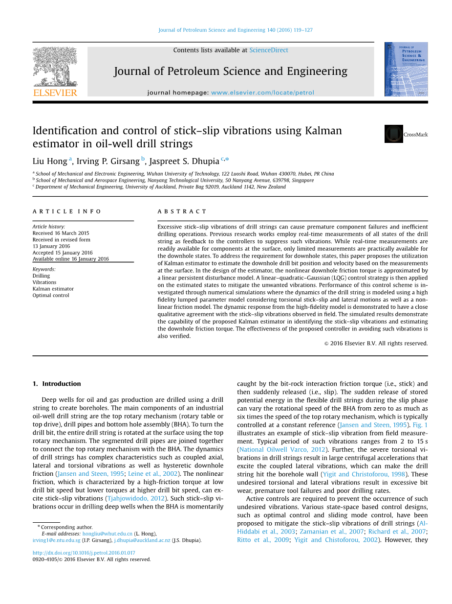 对于卡尔曼估计器设计,称重因子Q和R分别表示对测量和模型的信心。与模型信息相比,Q的大值与对测量信号的信心增强有关。另一方面,R的大值与对测量信号的不信任感有关。由于测量结果包括非线性扰动对模型状态的影响,而模型状态没有被假设的线性模型所捕获,因此在矩阵R中使用大值将会过滤掉这些信息,并不能根据测量(Girsang和Dhupia, 2013年)更新扰动项。乔治et al .,2008)。在这项研究中,权重因子Qfrac14;35和重量基于模拟结果的调优,计算卡尔曼增益l,验证卡尔曼估计器在识别粘滑振动发生时的有效性(如图7所示),Eqs中描述的真实植物模型。(2)-(16)随调谐PI控制器与卡尔曼估计器增强,如图10所示。估计量的输入控制输入扭矩T和测量从真正的植物ϕϕr和ṙ,这可从顶部测量旋转机制。图11比较了钻头的估计和测量转速。可以看出,提出的线性卡尔曼估计器能够反映井下粘滑振动的发生。它还能很好地估计比特速度的振幅,这对于评估振动的严重程度至关重要。然而,当钻头在棒子区域时,估计误差会明显增大。如图12所示,这一现象是由于线性估计器无法估计非线性的预滑移相,也无法估计由于滞后效应引起的旋转速度的突然变化。