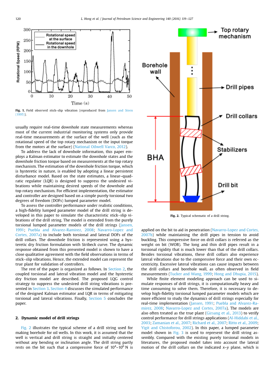 石油和天然气开采的深井用钻柱钻出钻孔。工业油井钻柱的主要部件是顶部旋转机构(旋转台或顶驱)、钻杆和井底钻具组合(BHA)。为了转动钻头,整个钻柱使用顶部旋转机构在表面旋转。将分段钻杆连接在一起,连接顶部旋转机构与底部钻具组合。钻柱动力学具有耦合轴向、横向振动和扭转振动等复杂特性,以及滞回摩擦(Jansen和Steen, 1995;Leine et al.,2002)。非线性摩擦,其特点是低钻头转速下的高摩擦力矩,但在较高的钻头速度下扭矩较小,可以引起粘滑振动(Tjahjowidodo, 2012)。这种粘滑振动发生在钻井深井中,当钻井液与钻头-岩石相互作用摩擦扭矩。突然释放的势能存储在滑动阶段,可以改变底部钻具组合的转速从零到六倍的速度旋转机制,这是通常控制在一个恒定的参考(Jansen和Steen,1995)。从现场测量中举例说明了粘滑振动的实例。这种震动的典型周期为2到15秒(National Oilwell Varco, 2012)。此外,钻柱中严重的扭转振动导致了巨大的离心加速度,使耦合的横向振动引起振动,从而使钻柱撞击井壁(Yigit和Christoforou, 1998)。这些非理想的扭转和横向振动导致过度磨损,过早的工具失效和低的钻速。
