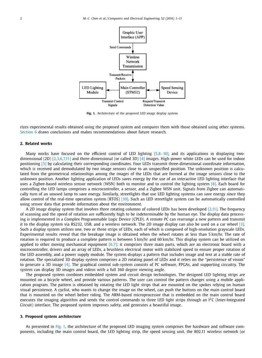 实验结果表明,当车轮以小于5公里/小时的速度旋转时,可以获得破损图像。以5公里/小时到60公里/小时之间的的速率旋转可以产生完整模式。这个显示系统可以适用于其他移动机械设备,它包括三个主要部分:一是一个电子板与一个微控制器,驱动器和一系列LED组件;二是具有稳定的速度以确保正确旋转的电机;三是电源模块。系统以稳定的速率显示包含图像和文本的图案。专用的3D显示系统包括一个由LED组成的2D旋转面板,它依赖于“持久视觉”生成一个3D图像。图形控制子系统由PC软件,FPGA和支持电路组成。该系统可以以完整的360度视角显示3D图像和视频。所提出的系统结合了嵌入式系统和电路设计技术。设计的LED照明条是安装在自行车车轮上,并显示各种图案。用户可以使用移动应用程序控制图像更改。该模式是通过旋转安装在辐条上的LED灯带而获得的视觉持久性。骑自行车的人想要改变车轮上的图像,可以在骑行之前按下安装在车轮的主控板上的按钮。嵌入在主控制板上的基于ARM的微处理器执行成像算法,并通过I2C(Inter-Integrated)将控制命令发送给三个LED灯条电路接口。所提出的系统提高了安全性,并产生了美丽的图像。