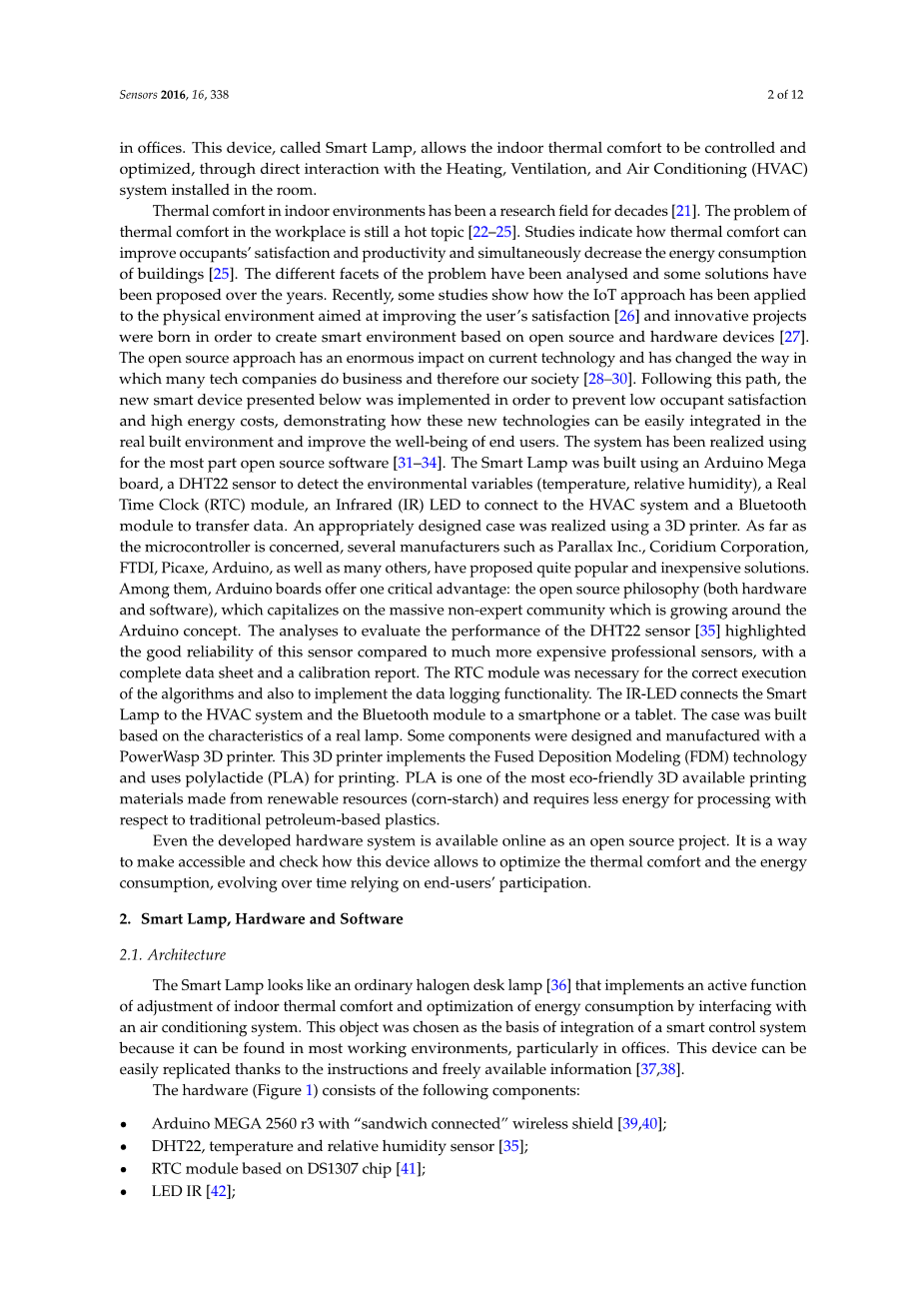 几十年来,工作场所的热舒适问题仍然是一个热门话题[22-25]。研究表明热舒适可以提高居民的满意度和生产力,同时降低建筑物的能耗[25]。对问题的不同方面进行了分析,并提出了一些解决方案。最近,一些研究表明物联网方法如何应用于旨在提高用户满意度的物理环境[26],创新项目的诞生是为了创建基于开源和硬件设备的智能环境[27]。开源方法对当前的技术产生巨大影响,并改变了许多科技公司开展业务的方式,因此也改变了我们的社会[28-30]。遵循这一路线,下面介绍的新智能设备的实施是为了防止低乘员满意度和高能耗成本,展示了这些新技术如何轻松地集成到真实的建筑环境中,并改善最终用户的福祉。该系统已经实现了大部分开源软件[31-34]。 Smart Lamp采用Arduino Mega电路板,DHT22传感器来检测环境变量(温度,相对湿度),实时时钟(RTC)模块,连接到HVAC系统的红外(IR)LED和蓝牙模块传输数据。使用3D打印机实现了适当设计的案例。就微控制器而言,几家制造商如Parallax Inc.,Coridium Corporation,FTDI,Picaxe,Arduino以及其他许多制造商已经提出了非常流行且便宜的解决方案。其中,Arduino板卡提供了一个关键优势:开源哲学(硬件和软件),它利用了围绕Arduino概念发展的庞大的非专家社区。评估DHT22传感器性能的分析[35]强调了该传感器与更昂贵的专业传感器相比具有良好的可靠性,并附有完整的数据表和校准报告。 RTC模块对于正确执行算法以及实现数据记录功能是必需的。 IR-LED将智能灯连接到HVAC系统,将蓝牙模块连接到智能手机或平板电脑。该案件是基于真实灯具的特点而建立的。某些组件是使用PowerWasp 3D打印机设计和制造的。这款3D打印机采用熔融沉积造型(FDM)技术,并使用聚丙交酯(PLA)进行打印。 PLA是由可再生资源(玉米淀粉)制成的最环保的3D可用印刷材料之一,并且与传统的石油基塑料相比,需要更少的能量来加工。