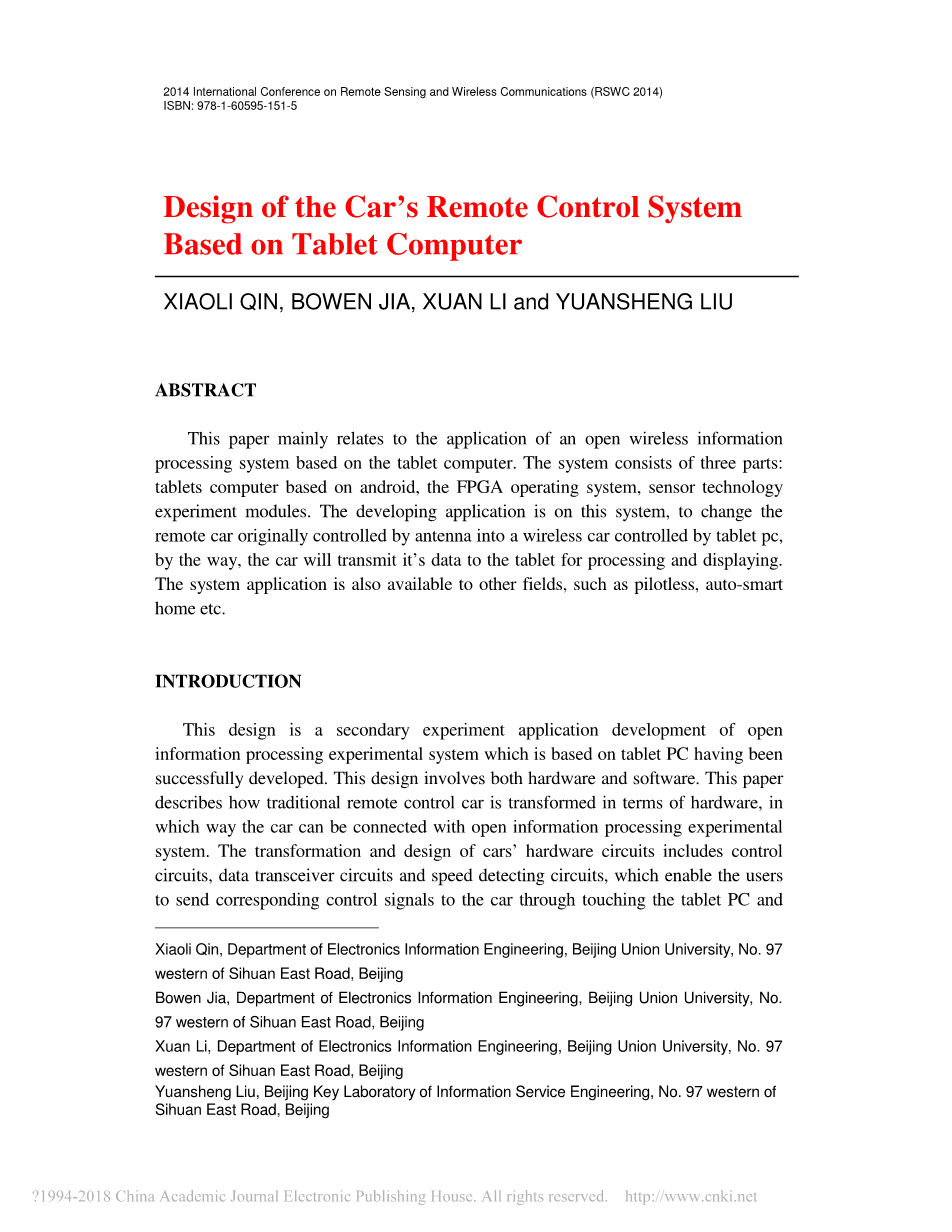本文主要涉及基于平板电脑的开放式无线信息处理系统的应用。 该系统由三部分组成:基于android的平板电脑,FPGA操作系统,传感器技术实验模块。 该系统正在开发应用,将原本由天线控制的遥控车改为由平板电脑控制的无线车,顺便将车的数据传送到平板电脑进行处理和显示。 该系统应用程序也可用于其他领域,如无人驾驶汽车,智能家居等。