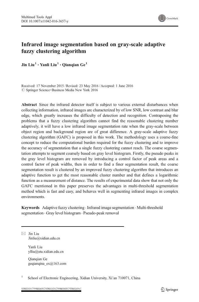 摘要 由于红外探测器本身在收集信息时会受到各种外部干扰,红外图像具有低信噪比、低对比度、边缘模糊的特点,这大大增加了检测和识别的难度。针对模糊聚类算法不能自适应地找到合理的聚类数的问题,当目标区域和背景区域的灰度差异较大时,红外图像分割率较低。本文提出了一种灰度自适应模糊聚类算法(GAFC)。该方法采用粗-细概念,减少了模糊聚类所需的计算量,提高了单一模糊聚类所不能达到的分割精度。粗分割尝试基于灰度直方图进行粗分割。首先,通过引入峰值面积控制因子和峰值宽度控制因子来去除灰度直方图中的伪峰值,然后为了找到更好的分割结果,采用改进的模糊聚类算法对粗分割结果进行聚类,该算法引入一个自适应函数来获得最合理的聚类数,并定义一个对数函数作为距离的度量。实验结果表明,本文提出的GAFC不仅保留了多阈值分割方法的快速、简便的优点,而且在复杂环境下的红外图像分割中表现良好。