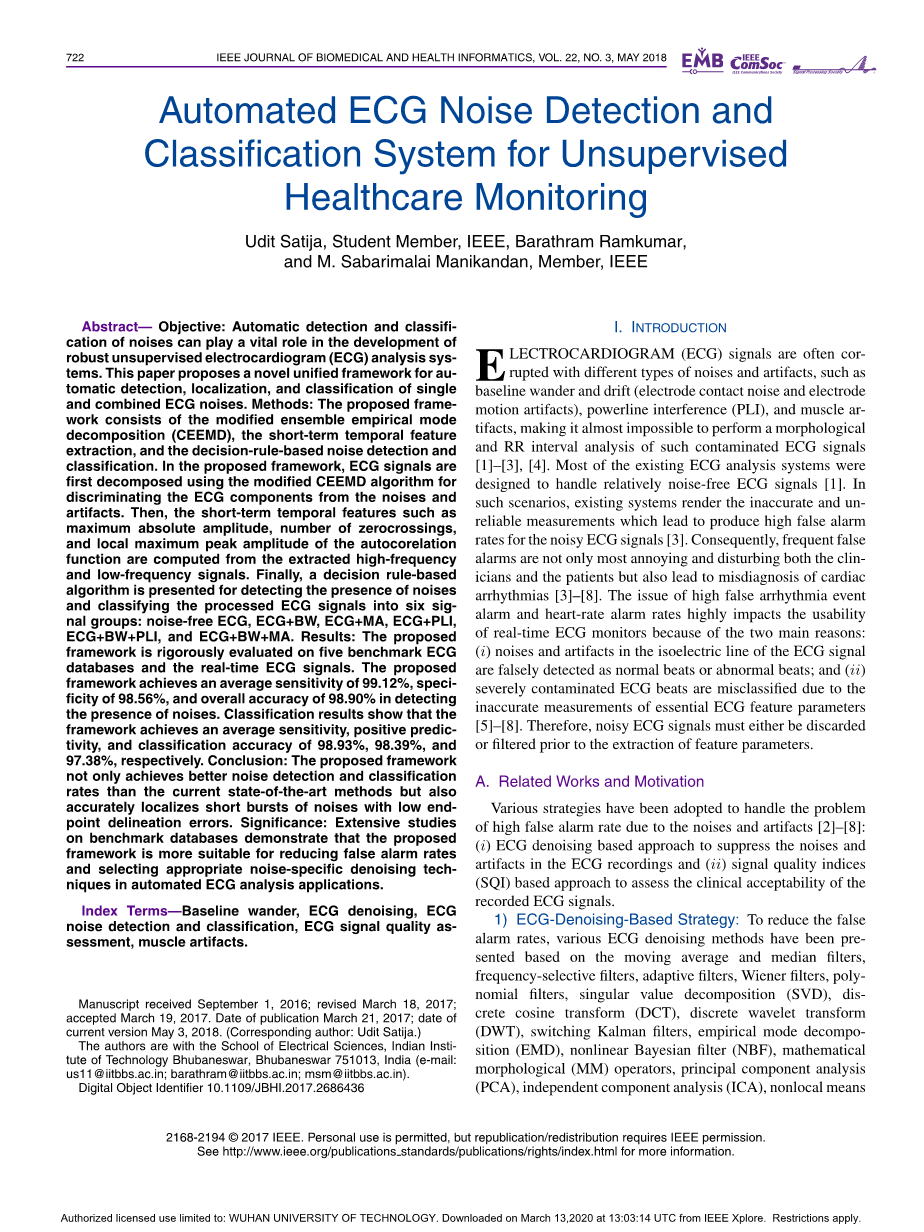 不同的策略已经被采用去处理由于噪声和伪影造成的高误报率。(i)基于心电图去噪在心电图记录中抑制噪声和伪影(ii)信号质量指标(SQI)的基础上评估的具有临床可接受记录心电图信号方法。