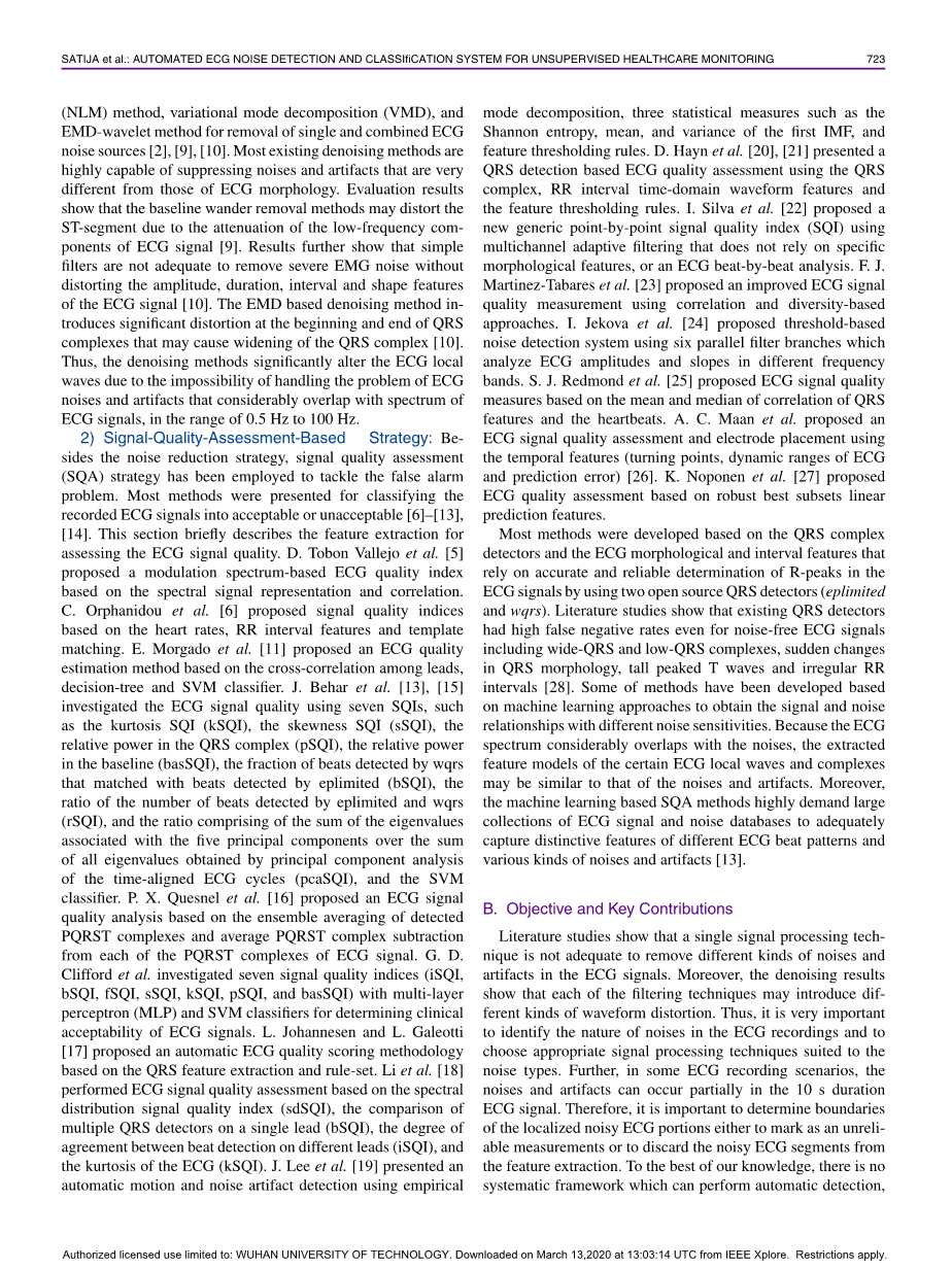 2 )信号质量评估 策略: 除了降噪策略, 信号质量评估(SQA)策略已被用来处理误报问题。提出了多种方法将记录的心电图信号划分为到可采用或不可采用[6]- [13],[14]。本节简要描述了评估心电信号质量的提取特点。D. Tobon Vallejo等,[5]提出了一种基于频谱调制的心电质量指标,来自于光谱谱信号的表示和相互关系。C. Orphanidou等人提出了[6]信号质量指标基于心率,RR间隔特征和模板匹配。E. Morgado等人提出了一种基于导联间互相关的心电图质量估计方法决策树和SVM分类器。J. Behar等人,[13],[15]应用7个SQIs对心电信号质量进行了分析,例如峰度SQI (kSQI),偏度SQI (sSQI)在QRS波函数(pSQI)中,相对功率为在基线(basSQI)中,wqrs检测到的节拍的比例与(bSQI)检测到的节拍相匹配由bqrs和wqrs检测到的拍数之比(rSQI),以及特征值和的比值与5个主要成分的总和有关,通过时间对齐心电周期的主成分分析得到的所有特征值(pcaSQI),以及SVM分类器。P. X.奎斯奈尔等人,提出了一个基于PQRST复合物检测结果的集成平均的质量心电图信号分析,即平均PQRST复合波减去每个PQRST复合波的心电信号。G.D克里弗德等人研究了7个信号质量指标(iSQI,bSQI, fSQI, sSQI, kSQI, pSQI, basSQI),具有多层结构和可接受性,用于临床诊断心电信号的感知器(MLP)和SVM分类器。约翰内森和加莱奥蒂[17]提出了一种自动心电质量评分方法,它基于QRS特征提取和规则集。Li等人,[18]进行基于频谱的心电信号质量指数(sdSQI),比较多个QRS检波器对一个信号的监测(bSQI),不同心跳信号之间监测的一致程度(iSQI)和心电图的峰度(kSQI)的心电图质量评估。J. Lee等人提出了一个自动运动和噪声伪影检测方法,使用经验模态分解,三项统计测量,例如香农熵,均值,和第一个IMF的变化,以及特征阈值规则。D. Hayn等人,[20],[21]提出了一个基于心电图质量评价的QRS波检测,利用了QRS复合波,RR区间时域波形特征和特征阈值规则。I. Silva等人提出了一个新属性的逐点信号质量指数(SQI),利用了不依赖于形态学特征的多通道自适应滤波,也不依赖于心电图逐拍分析。f·J。Martinez-Tabares等人提出了一种改进的心电信号质量量度,使用相关性和基于多样性的方法。I. Jekova等人提出了基于阈值的[24]噪声检测系统,采用六个并联滤波支路,分析不同频率的心电图振幅和斜率。S. J. Redmond等人提出了[25]心电信号质量测量方法,基于QRS特征和心跳相关的平均值和中位数。A. C. Maan等人提出了心电信号质量评估及电极放置时间特征(心电图转折点、动态范围和预测误差)[26]。K. Noponen等人提出了[27]基于稳定最佳子集线性预测特点的心电质量评估。