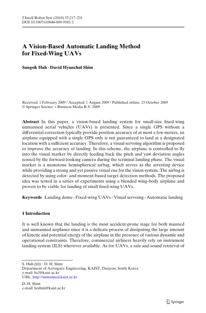 在这篇文章中,提出了一种为小型固定翼无人机的视觉着陆系统。由于单个不带误差校正的GPS通常只能提供最多几米的精确度,一个仅装备了单一GPS的无人机不能确保在指定的地点准确无误的着陆。因此,一种用于提高着陆准确度的视觉伺服算法被提出了。在该方案中,通过直接反馈前视摄像头在末端着陆阶段检测到的俯仰角和偏航角,控制飞机飞进视觉标记。这个视觉标记是一个单一的半球形气球,它作为一个醒目的装置的同时还能为视觉系统提供一个强大且被动的视觉线索。气囊的检测基于颜色和动量的目标检测方法。该方法在混合翼-机身飞机上进行了一系列试验,并被证明适用于小型固定翼无人机的着陆。