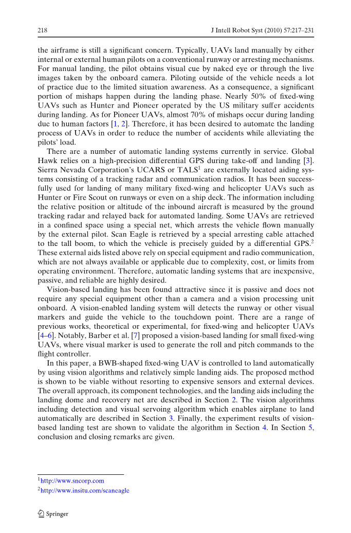 众所周知,无论是载人飞机还是无人飞机,着陆都是最容易发生事故的阶段,因为它是一个微妙的过程,在各种动态和操作约束条件下,消耗飞机的大量动力学和潜在能量。因此,商用客机严重依赖仪表着陆系统(ILS)。至于无人机,安全可靠的机身回收仍然是一个重要的问题。通常,无人机由飞行员在内部或外部降落在传统的跑道或阻拦机构上。对于手动降落,飞行员通过肉眼或者由机载的摄像机获得的实时图像来获得视觉提示。由于能得到的位置信息有限,在无人机外领航需要很多的经验。因此,相当一部分事故发生在降落阶段。美国军方运营的“猎人”和“先驱者”等近50%的固定翼无人机在着陆时遭遇事故。对于“先驱者”无人机,近70%的事故发生在无人机着陆中,是由人为因素引起的 [1,2]。因此,为了缓解飞行员的符合的同时减少事故发生,人们希望能够实现无人机着陆的自动化。