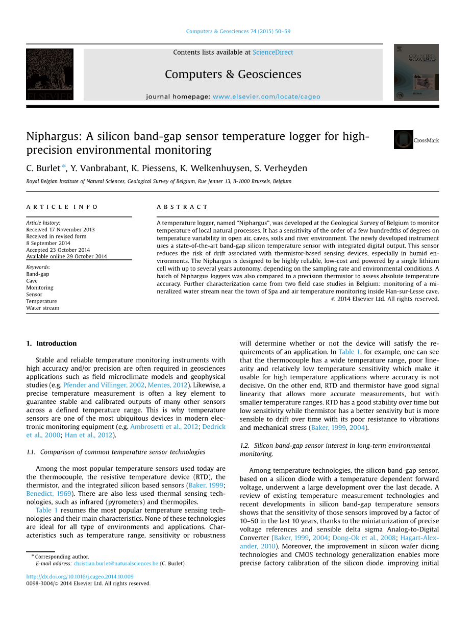 比利时地质调查局开发了一种名为“Niphargus”的温度记录器,用于监测当地自然过程的温度。它对露天、洞穴、土壤和河流环境中的温度变化具有几百度的敏感性。新开发的仪器采用最先进的带隙硅温度传感器和集成数字输出。这种传感器降低了与热敏电阻传感装置相关的漂移风险,特别是在潮湿环境中。根据采样率和环境条件的不同,Niphargus的设计是高可靠性、低成本的,并由一个锂电池供电,可自主运行数年。将一批Niphargus记录器与精密热敏电阻进行比较,以评估绝对温度精度。进一步的特征来自比利时的两个现场案例研究:Spa镇附近矿化水流的监测和Han-sur-Lesse洞穴内的气温监测。