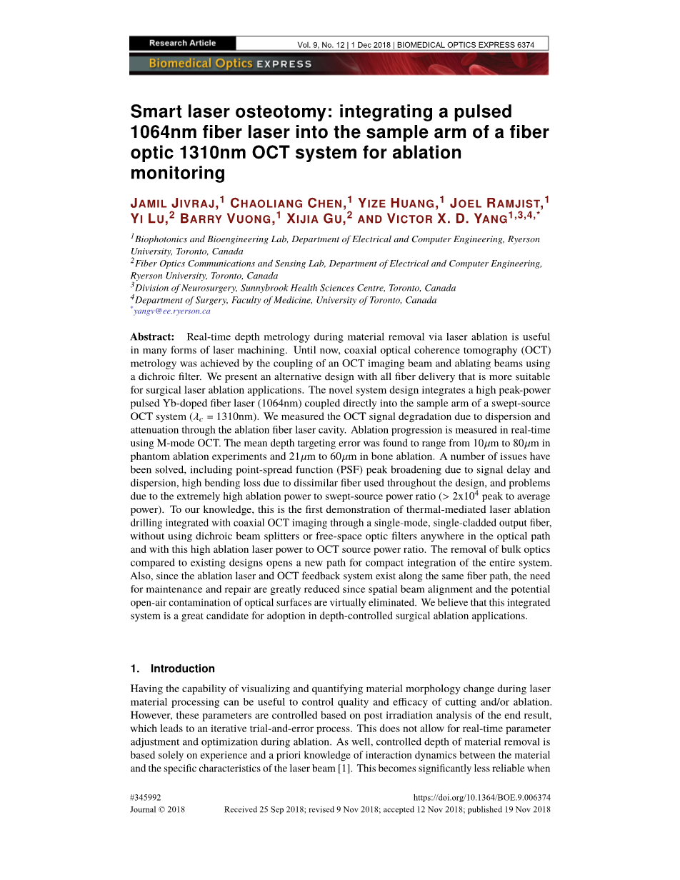 智能激光截骨术:将脉冲1064nm光纤激光器集成到1310nm光纤OCT系统的样本臂中进行消融监测