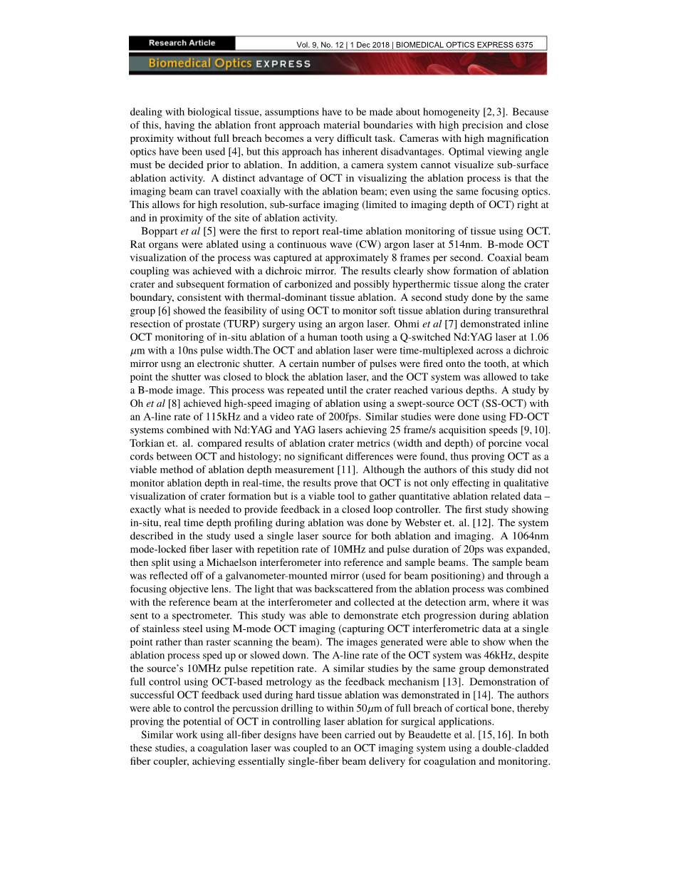 Boppart等人[5]首次提出了利用OCT对组织进行实时消融监测。大鼠器官在514nm处用连续波氩激光消融,以大约每秒8帧捕获该过程的B模式OCT可视化。用二向色镜实现同轴光束耦合,与热优势组织烧蚀一致,其结果清楚地显示了烧蚀坑的形成及之后沿烧蚀坑边界形成的碳化组织和可能的高温组织。由同一组进行的第二项研究[6]表明了OCT用氩激光监测经尿道前列腺电切术(TURP)中的软组织消融的可行性。Ohmi等人[7]展示了在1.06mu;m、10ns脉冲宽度的调Q Nd:YAG激光器上对人牙原位消融的在线OCT监测。利用电子快门将OCT和烧蚀激光通过二色镜进行时间复用,在牙齿上发射一定数量的脉冲,此时关闭快门以阻挡烧蚀激光,OCT系统被允许拍摄B模式图像。不断重复这个过程,直到灼烧坑达到不同的深度。Oh等人的一项研究[8]使用扫描源OCT(SS-OCT)实现了消融的高速成像,其A线速率为115kHz,视频速率为200fps。一个类似的研究利用FD-OCT系统,结合Nd:YAG和YAG激光器,获得了25帧/秒的捕获速度[9,10]。Torkian等人比较了OCT与组织学对猪声带灼烧坑测量(宽度和深度)的结果,没有发现显著差异,从而证明OCT是一种可行的烧蚀深度测量方法[11]。虽然这项研究的作者没有实时监测烧蚀深度,但结果证明OCT不仅可以对弹坑形成过程进行定性的可视化,而且是收集定量烧蚀相关数据的一种可行工具,这正是在闭环控制器中提供反馈所需的。首次显示烧蚀过程中的原位实时深度剖面的研究是由韦伯斯特等人完成的[12],研究中描述的系统使用单一激光源进行烧蚀和成像。将重复频率为10MHz、脉冲宽度为20ps的1064nm锁模光纤激光器进行扩展,用迈克尔逊干涉仪将其分为参考光和样品光。样品光束通过安装在电流计上的反射镜(用于光束定位)和聚焦物镜反射。烧蚀过程中产生的后向散射光与干涉仪上的参考光结合在一起,在探测臂处收集,然后送到光谱仪。这一研究利用M型OCT成像(在单点捕获OCT干涉数据,而不是光栅扫描光束)来显示不锈钢烧蚀过程中的刻蚀过程。生成的图像能够显示烧蚀过程何时加快或减慢。尽管OCT系统的光源的脉冲重复频率为10MHz,但A线频率为46kHz。同一团队的类似研究论证了以OCT计量为反馈机制的全控制 [13]。在硬组织消融过程中成功使用OCT反馈的证明见[14]。作者能够将冲击钻孔控制在皮质骨完全断裂的50mu;m范围内,从而证明了OCT在控制激光消融外科应用方面的潜力。