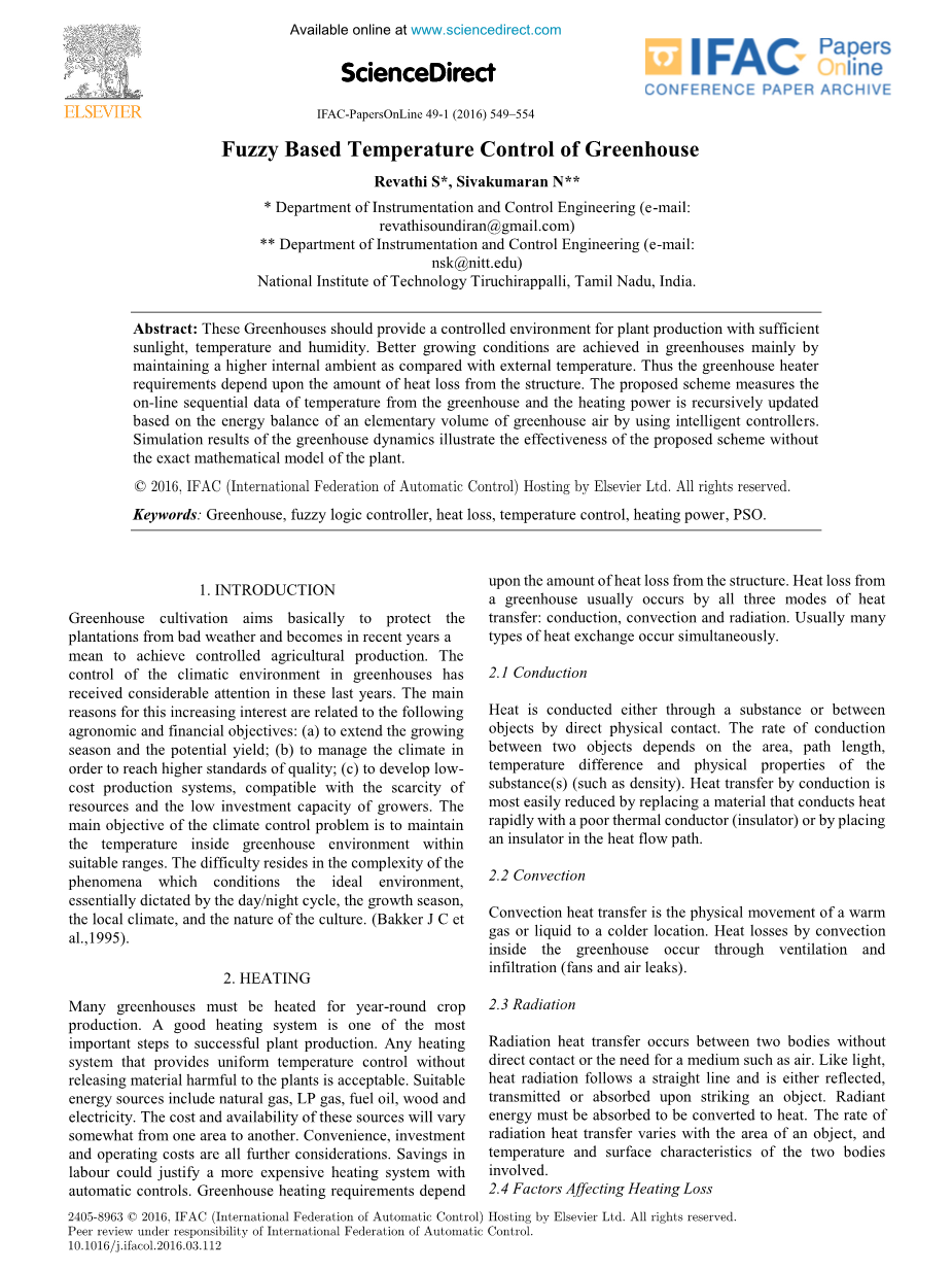 关键词:温室、模糊逻辑控制器、热损失、温度控制、加热功率、粒子群算法。