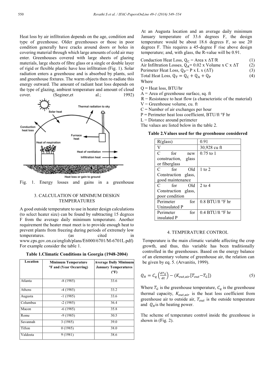 温度是影响作物生长的主要气候变量,因此,传统上在温室中控制温度。基于温室空气基本体积的能量平衡关系,可由式5给出关系式.(阿瓦尼蒂斯,1999)。