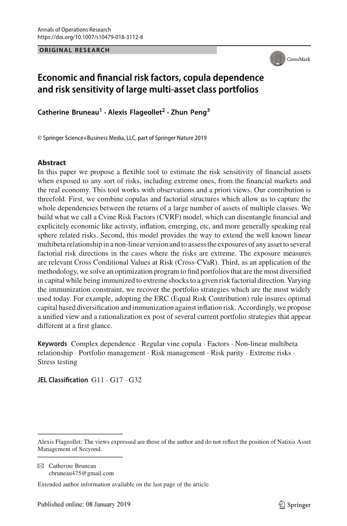 本文中,我们提出了一种灵活的工具来估计金融资产的风险敏感性,包括极端风险在内的各种风险,从金融市场到实体经济领域。此工具适用于观察和先验视图。我们的贡献体现在三个方面。首先,我们结合copulas和因数的结构,使我们能够捕获多个类的大量资产的收益之间的整体依赖关系。构建了我们称之为Cvine Risk Factors(CVRF)的模型,它可以分清金融和明显的经济类活动,如通货膨胀,新兴等,更普遍地说是实际领域的相关风险。其次,该模型提供了将众所周知的多贝塔系数线性方法扩展到非线性版本中的方法,并且在风险极端的情况下评估任何资产在多个风险因子的暴露程度。暴露程度衡量的是相关的风险交叉条件价值(Cross-CVaR)。第三,作为应用程序方法论,我们提出一个优化计划,找到在资本中最多样化的投资组合,同时不受特定方向的风险因素的极端冲击影响。在抗扰约束的变化下,我们回到了现今最广泛使用的投资组合策略。例如,采用ERC(等风险贡献)规则,确保最佳的基于资本多样化的分散经营和抵御通货膨胀风险的方法。因此,我们建议将第一眼看上去不同的几种投资组合策略观点进行统一化和事后合理化。