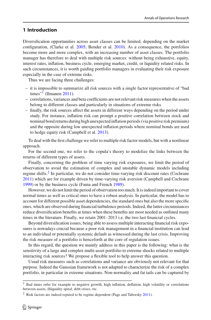 根据市场的不同,资产类别的多样化配置可能会受到限制。因此,随着更多资产类别的出现,投资组合变得越来越复杂。于是,投资组合的管理者必须处理多种风险来源:例如证券、利率、通货膨胀、商业周期、新兴市场、信贷或流动性相关风险等。在这种情况(特别是极端风险的情况)下,指导投资组合经理评估其风险敞口,是很有价值的。我们面临三个挑战: