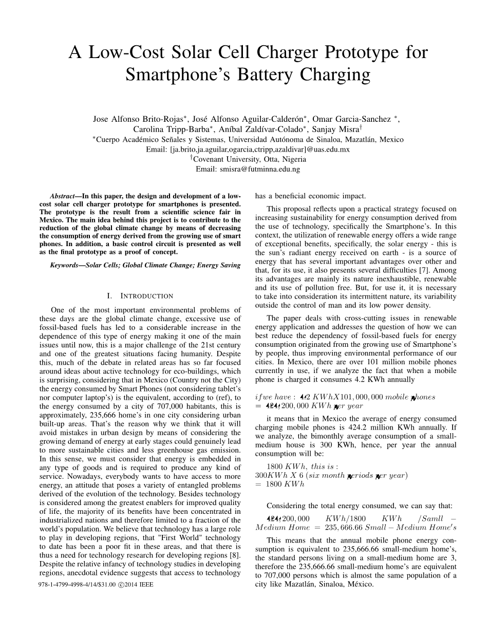 在这项工作中,我们提出了一个低成本的以太阳能电池为原型的的智能手机充电器。原型目前可以正常工作,并且可以在同一时间充电4部智能手机,且在1天可完全充满96部智能手机。这项建议的关键点就在于这个原型可以节约大量能源,我们还必须强调这个原型造福于环境,仅仅考虑到只在本文中提到的城市的智能手机用户数量是不断增长的。