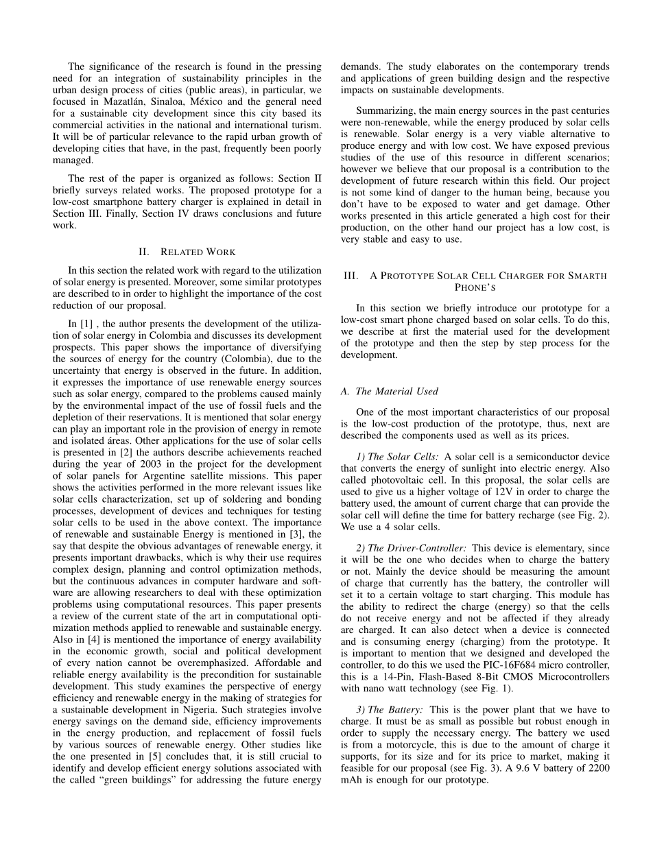 在[1]中,作者对哥伦比亚的太阳能利用的发展进行描述并探讨了其太阳能发展前景。由于涉及到对能源的未来观察的不确定性,本文在说明能量来源多样化对一些国家(哥伦比亚)的重要性。此外,本文还说明了相较由使用化石燃料所造成的环境问题和能源枯竭问题,使用如太阳能一般的可再生能源的重要性。它同时提及了太阳能在对远程供能和对边远地区供能发挥了重要作用。对于使用的太阳能电池的其它应用,作者在[2]的对2003年阿根廷的以太阳能电池板为供能的卫星任务的成果描述有了很好的体现。本文还展示了更多有类似于太阳能电池特性的相关问题的活动,包括焊接和粘接的工艺,在上述情况下所使用的太阳能电池的设备的开发和技术测试。[3]部分会提到可再生可持续能源的重要性,尽管可再生能源有明显的优点,它仍然有无法忽视的重要问题,这就是为什么使用此类能源需要复杂的设计,规划和控制的优化方法,但在计算机硬件和软件的不断进步发展的情况下,研究人员才能够使用计算机的资源来处理这些问题。本文目前是以一种计算机优化到可以适用于当前的可再生可持续能源的认知前提来讨论的。另外,在[4]中提到的能源在每个国家的经济增长,社会和政治发展的可用性的重要性都不为过。经济实惠和可靠的能源供应是可持续发展的前提。本文是以制定尼日利亚的可持续发展为战略的高效可再生能源为角度来讨论。这些战略包括在对必要的能源的节约,提高产能的效率,和以多种来源的可再生能源来替换化石燃料。其他的研究就如同在[5]提出一个结论一样,它仍然是确定并开发与所谓的为解决未来能源需求的“绿色建筑”而相关联的高效能源的解决方案的关键。该研究详细阐述了绿色建筑设计的当代潮流和应用,也说明了对相应的可持续发展所产生的影响。