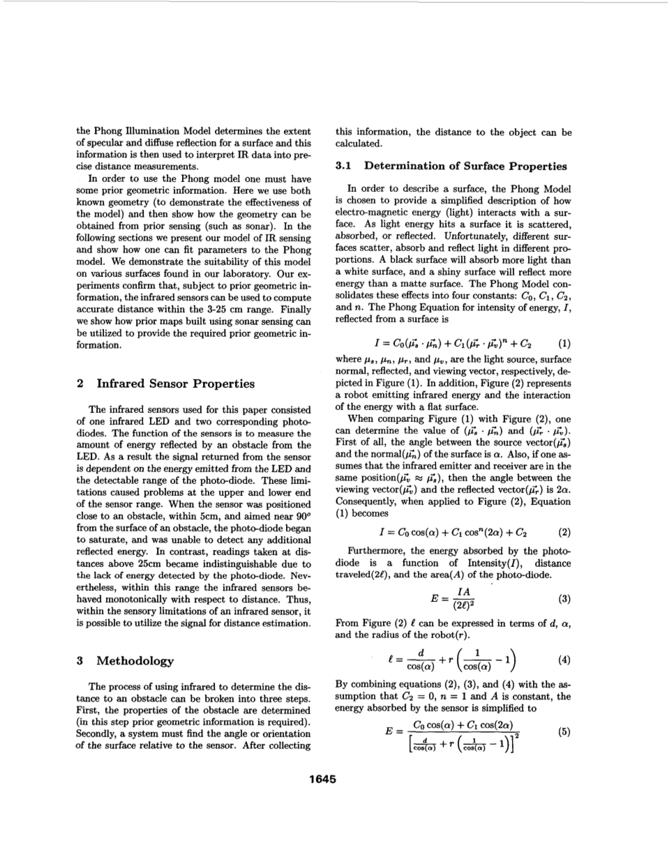 本文介绍了一种方法,该方法检测的红外反射特性的表面,并其后使用传感器读数等这些属性来计算距离。我们的方法的基础是冯氏光照光照模型[ 7 ],这是传统上用作着色算法在计算机图形程序。此模型被选择,因为它是能够近似的反射特性的任何表面点光源照明。虽然有许多品种的红外发光二极管,特别是LED用在我们的机器人对着一个小立体角,因此近似为点光源。此外,冯氏光照模型很容易操纵,代表这些反射特性的不同程度不同的表面,和许多与模型相关的变量是由系统的几何尺寸确定。结果,冯氏光照光照模型决定的程度一个表面的镜面反射和漫反射信息,然后用来解释红外数据到精确的距离测量。