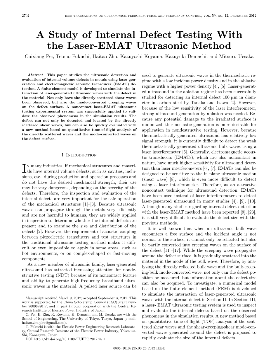 被部分地转化成爬波的表面上缺陷。而爬行波传播围绕缺陷表面,它被逐渐散入材料中的体波的模式。因此,通过分析直接反射的体波与大部分模式转换波,不仅可以对缺位置进行测量,但有关缺陷尺寸信息也可以获取。在第二节为了研究,数值模型基于有限元法(FEM)被显影模拟激光产生的超声波的相互作用波的内部缺陷。在第三节,激光电磁声换能器的超声检测系统,用于检查和评估基于所述观察到的内部缺陷以及模拟结果的现象。基于一种新方法关于散射的定量时间飞行分析剪切波和剪匍匐剪模式转换周围的缺陷产生的波,提出快速评估内部缺陷的大小。