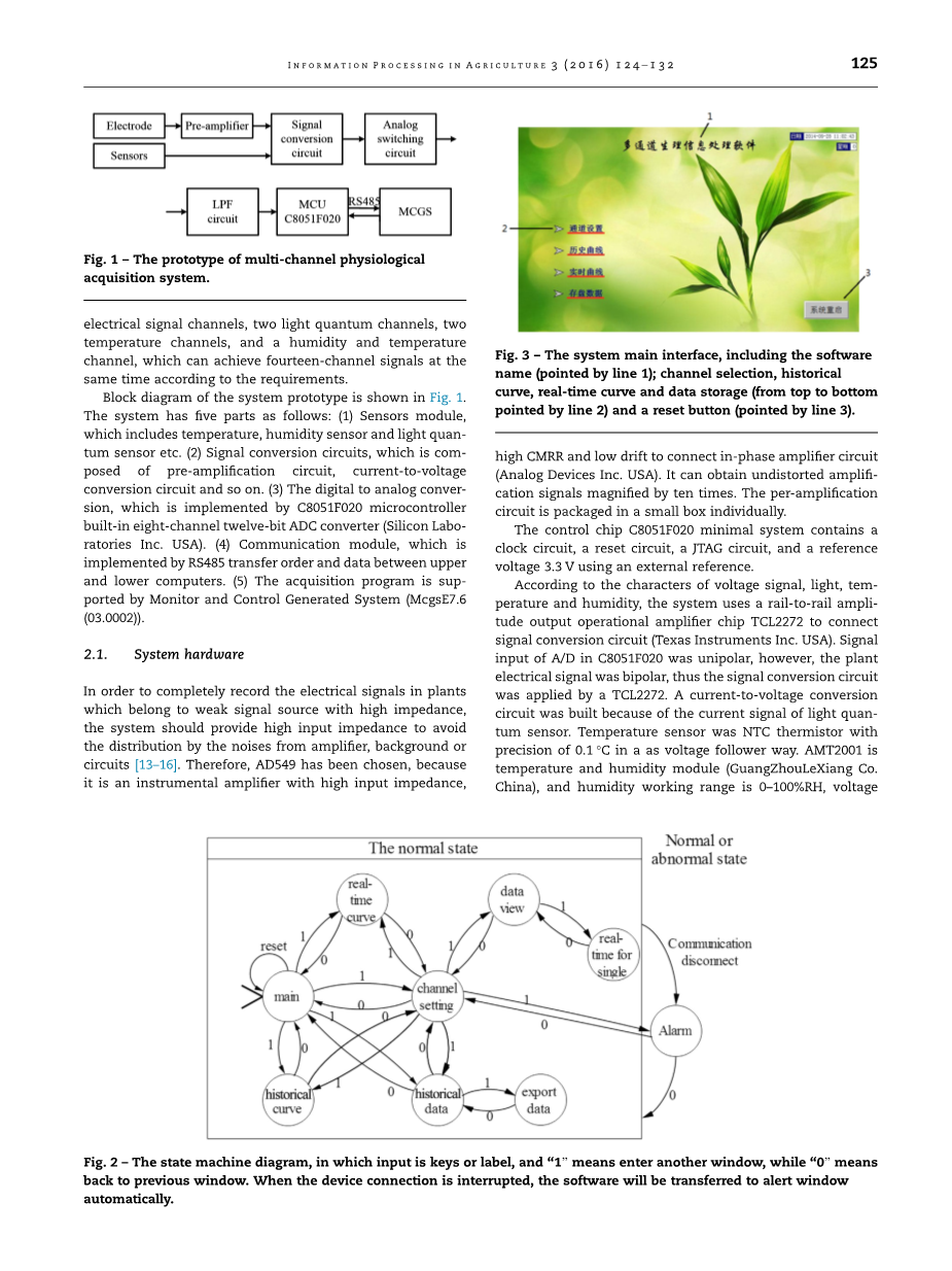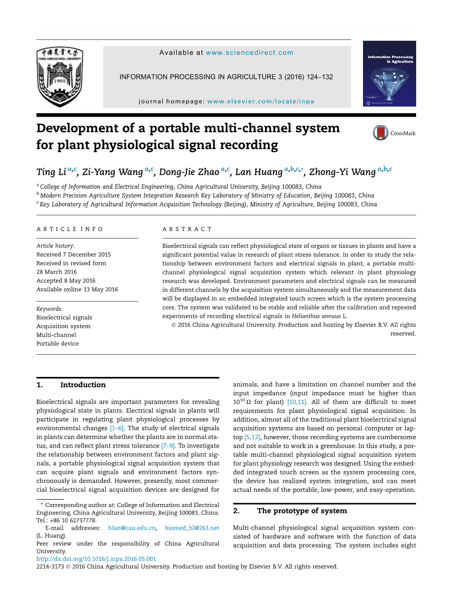 生物电信号是揭示植物生理状态的重要参数。 植物中的电信号随环境变化以参与调节植物生理过程[1-6]。 植物电信号的研究可以确定植物是否处于正常状态,并且可以反映植物耐受性[7-9]。 为了研究环境因素和植物信号之间的关系,需要一种可以同步获取植物信号和环境参数的便携式生理信号采集系统。然而,目前,大多数商业生物电信号采集装置是为动物设计的,并且对通道数和输入阻抗有限制(输入阻抗比植物高1010Omega;)[10,11]。所有这些都难以满足植物生理信号采集的要求。 此外,几乎所有的传统植物生物电信号采集系统都是基于个人计算机或笔记本电脑[5,12],然而,这些记录系统是繁琐的,不适合在温室中工作。 在本研究中,设计了用于植物生理学研究的便携式多通道生理信号采集系统。使用嵌入式集成触摸屏作为系统处理核心,实现了系统集成,可以满足便携式,低功耗,易操作的实际需要。