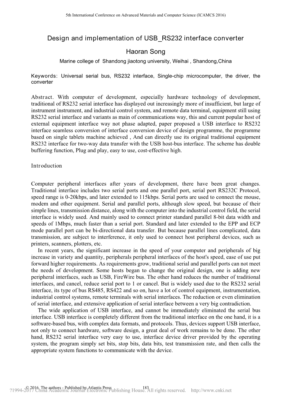 摘要:随着计算机的发展,尤其是硬件技术的发展,传统的RS232串行接口显示出越来越多的不足,但是大量的仪器仪表、工控系统、远程数据终端、设备仍在使用RS232串行接口和变种作为主要的通信方式,这和当前流行的主机外部设备接口方式不相适应,本文提出了一种USB接口到RS232接口界面无缝转换的转换装置的设计方案,该方案基于单片机实现,并且可以直接使用其原有的传统设备RS232接口与USB主机总线接口进行双向数据传输。该方案有双缓冲功能,即插即用,使用方便,性价比高。