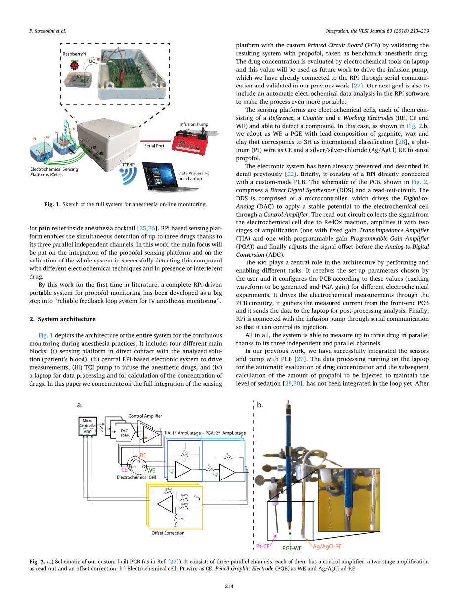 图1描绘了连续的整个系统的体系结构在麻醉过程中进行监测。它主要包括四个不同的部分:(1)传感平台直接接触分析的解决方案(患者的血液),(2)基于树莓派的中央电子系统驱动测量,(3)TCI泵输注麻醉药物和(4)用于数据处理和计算药物浓度的笔记本电脑。在本文中,我们通过验证用异丙酚作为基准麻醉药的系统,专注于使用印刷电路板(PCB)传感平台。通过笔记本电脑上的电化学工具评估药物浓度,并且这个值将用作驱动输液泵的未来工作,我们已经通过串行通信连接到树莓派,并在我们以前的工作中进行了验证[27]。我们的下一个目标也是包括树莓派软件中的自动电化学数据分析使过程更加便携。