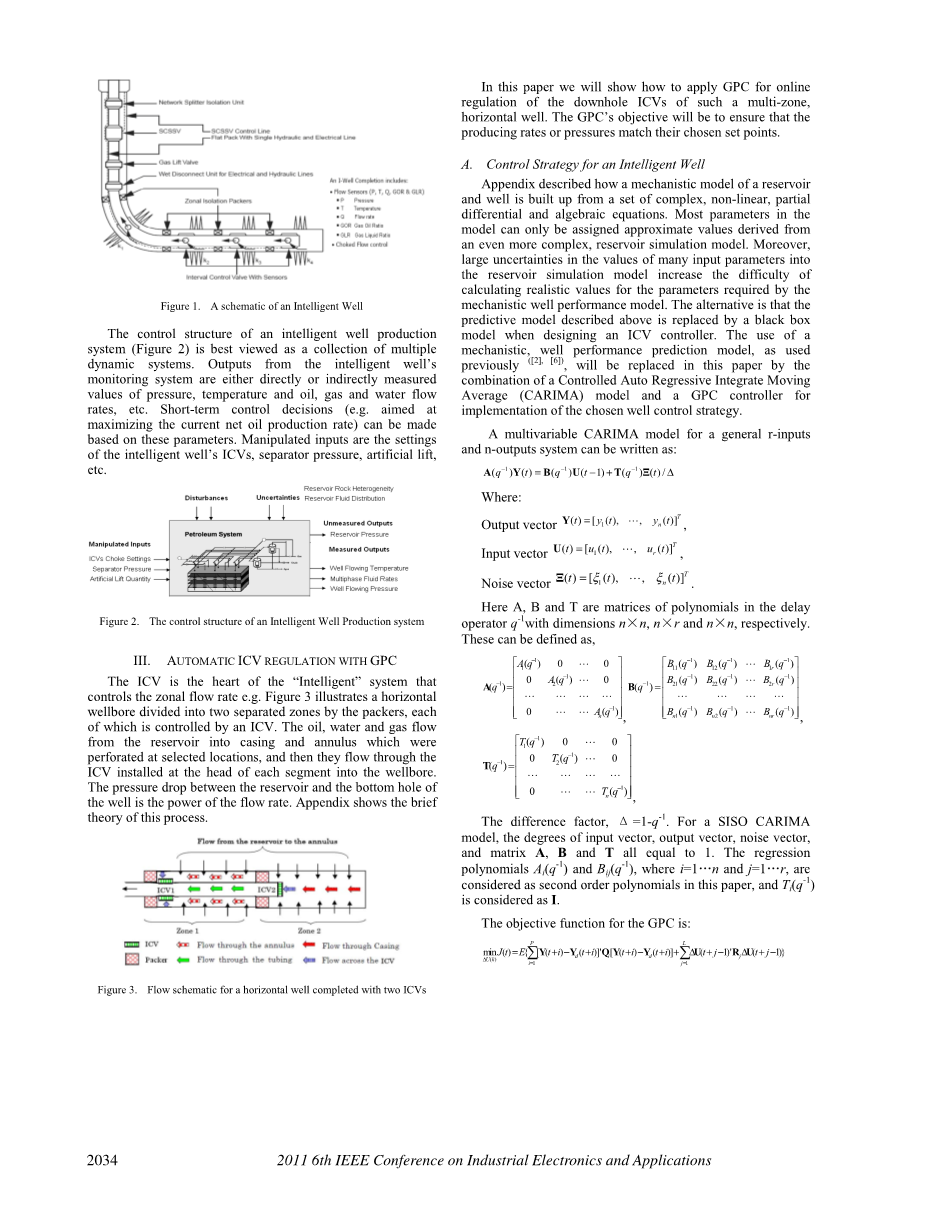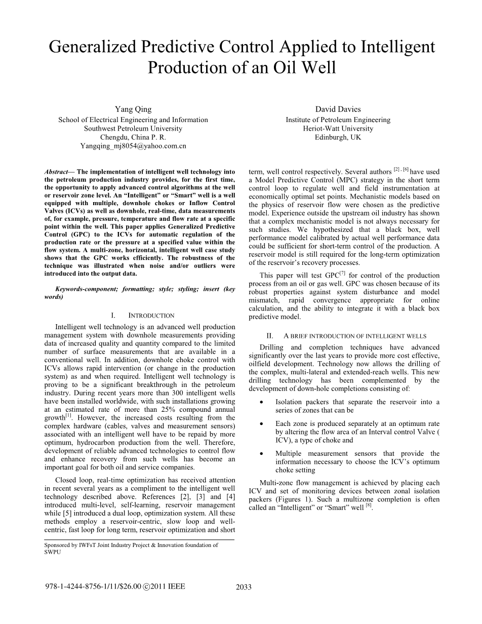 摘要——智能井技术进入到石油生产工业的实现首次提供了在油井或者石油储藏层应用先进控制算法的机会。“智能”井是一口井配备有多个井下节流器或流量控制阀( icvs)以及能够实现井下实时数据测量,例如井内特定的压力、温度和流量。本文采用广义预测控制( GPC )到流量控制阀(icvs)中,用于自动调节 生产速率或者调节这个流动系统中的压力保持在一个特定的值。多区域、多层次的智能井案例研究表明GPC能有效地工作。当噪音和/或异常值被引入到输出数据中时这个工艺的鲁棒性得到了说明。