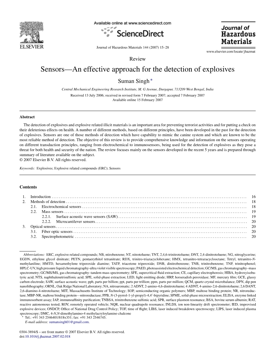 在这篇综述文章中,试图积累过去5年来在基于传感器的爆炸物探测方法的发展方面所做的研究,这些爆炸物或者作为隐藏材料或者作为水和土壤的污染物。