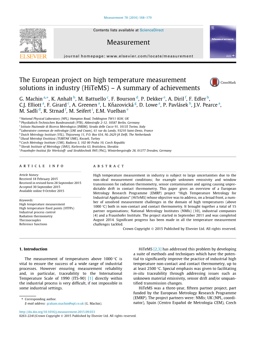 Hitems是一个为期三年、15年的合作项目,部分由欧洲计量研究计划(EMRP)资助。项目合作伙伴包括:NMI;英国(NPL,协调员)、西班牙(Centro Espa_ol de Metrologia CEM)、捷克共和国(CMI)、法国(LNE和CNAM)、意大利(istituto Nazionale di Ricerca Metrologia Inrim)、德国(PTB)、斯洛伐克(SMU)、土耳其(Turkish National Metrology Institute,Tubitak Ume)、荷兰(VSL)和工业家GDF Suez(GDF)fr。安斯,美捷特传感系统(MSS)英国,能源委员会,原子能和辅助能源替代品(CEA)法国和Endress Hauser(E H)德国。此外,德国弗劳恩霍夫材料与光束技术研究所(FHG)还获得了一项卓越奖(Reg)研究员,专门从事激光焊接和材料加工。在项目启动后,巴伐利亚应用能源研究中心(Zae Bayern)获得了第二笔注册拨款,其作用是对HITEMS所涵盖的过程中通常遇到的材料进行发射率测量。