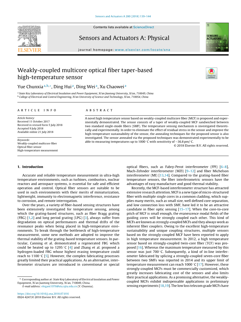 多年来,各种基于光纤的传感结构已被广泛研究用于温度传感,其中基于光栅的结构,如光纤布拉格光栅(FBG)[1,2]和长周期光栅(LPG)[3]当放置在高温环境中时,总是遭受光学性能的降低和共振峰的热漂移。为突破高温测量的瓶颈,采用了一些新方法来提高光栅温度传感器的热稳定性。尤其是Canning等人。展示了一种再生的FBG,它可以加热到1295℃[4]和张等人。提出了一种氢负载FBG,其最高擦除温度可以达到1100℃[5]。然而,复杂的制造工艺极大地限制了它们的实际应用。作为替代方案,在常规或特殊光纤中引入干涉仪结构,例如法布里 - 珀罗干涉仪(FPI)[6-8],马赫 - 曾德尔干涉仪(MZI)[9-12]和光纤迈克尔逊干涉仪(MI)[ 13,14]。与基于光栅的光纤温度传感器相比,光纤干涉传感器具有易于制造和良好的热稳定性的优点。