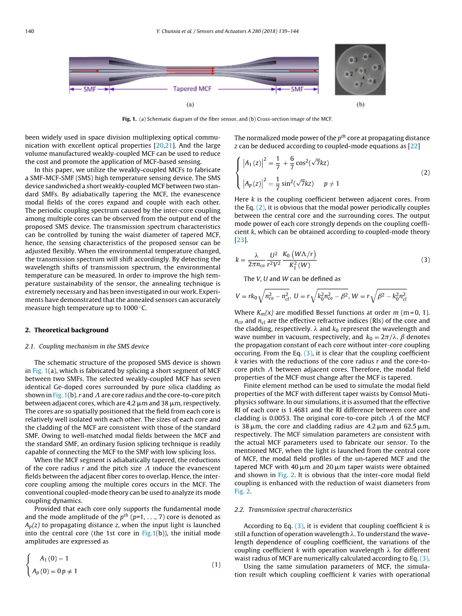 当MCF段绝热锥形时,芯半径r和节距尺寸的减小引起相邻光纤芯之间的消逝场重叠。因此,多个核之间的核间耦合发生在MCF中。传统的耦合模理论可用于分析其模式耦合动力学。