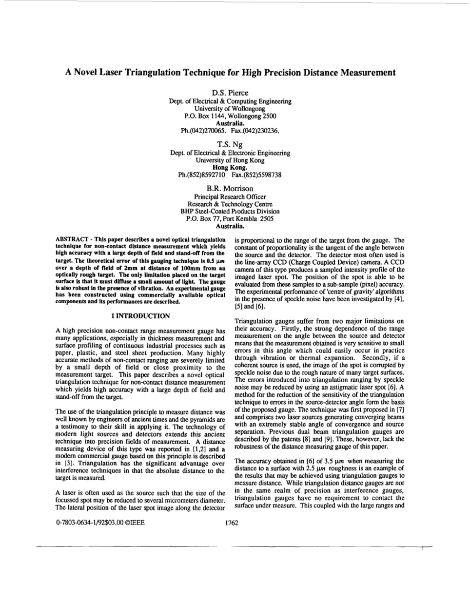 摘要:本文描述了一种新的光学三角测量技术,用于非接触距离测量,具有高精度,大深度飞散和远离目标的特点。这种测量方法的理论误差为0.5um,测量范围为从光学粗糙目标100mm到2mm。放置在目标表面上的唯一限制是必须使少量光线漫射。在存在振动的情况下,压力表也具有稳健性。本文介绍了用市售光学元件制作的实验压力表及其性能。