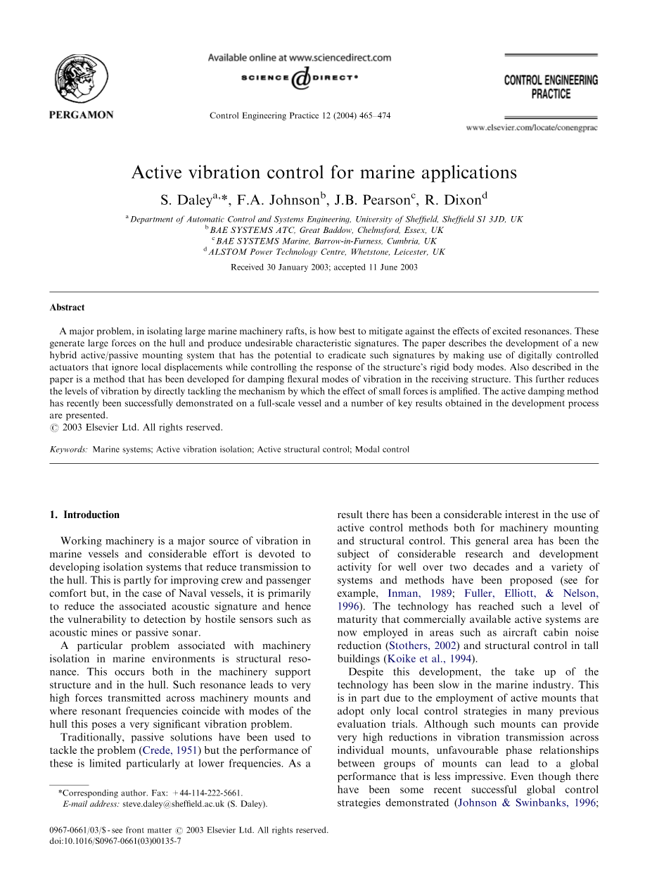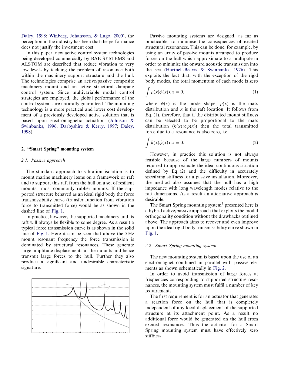 尽管有这种发展,但海洋工业对这项技术的采用仍然很慢。这部分是由于在许多先前的评估试验中采用仅采用局部控制策略的主动坐骑。虽然这种安装座可以在各个安装座上提供非常高的振动传递减少,但是安装组之间的不利相位关系可以导致不太令人印象深刻的全局性能。尽管最近已经有一些成功的全球控制策略得到了证明(Johnson&Swinbanks,1996; Daley,1998; Winberg,Johansson,&Lago,2000),但业界认为表现并不能证明投资成本是合理的。