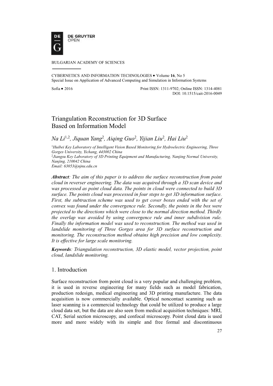 摘要:本文的目的是解决逆向工程中点云的表面重建问题。通过三维扫描设备获取数据,并作为点云进行处理。点云中的点用于构建三维曲面。点云需要进行四步处理才能得到三维信息曲面。首先,在收敛规则下,利用减法得到了以凸函数集合结尾的表面盒。然后,将盒子中的点投影到接近法线方向上。第三,利用收敛规则和内细分规则避免重叠。最后利用信息模型进行重构。将该方法应用于三峡库区滑坡监测中,进行三维地表重建与监测。该方法精度高,复杂度低。对大型监测十分有效。